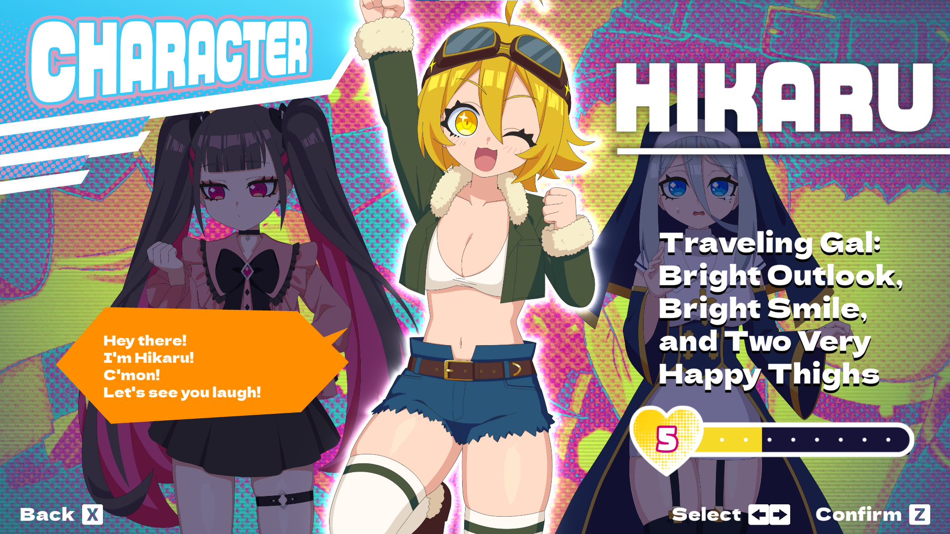 "I want to make everyone smile!" With this pure wish as her sole guide, the innocent traveler Hikaru journeys the world! To find her missing sister, she heroically CRUSHES any obstacle with her prized "Reinforced Thighs"! Bright as the sun, her destructive power comes with absolutely no ill-will or guilt, of course!