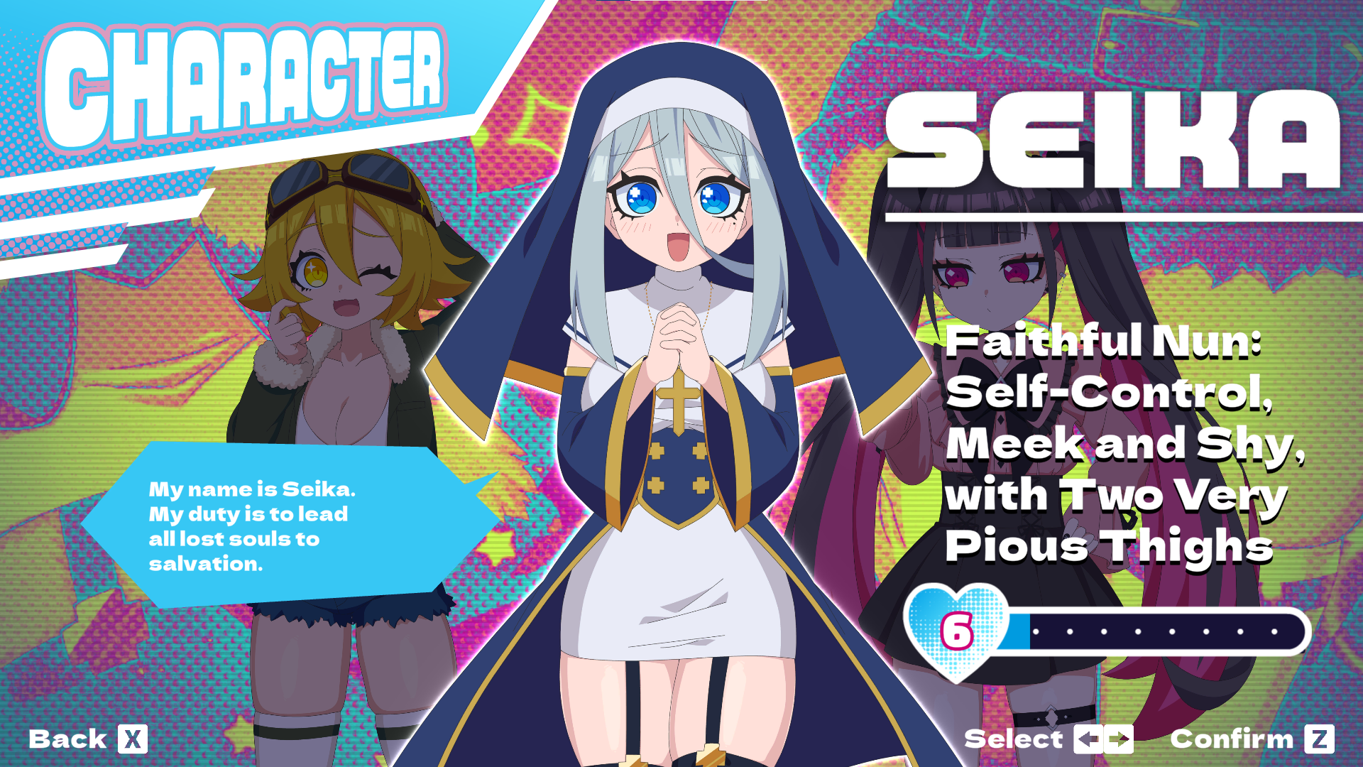 Seika is a shy sister torn between her duties in her sacred role and her earnest desire to be needed by someone. Hidden beneath her modest sister's attire, her "Thighs" hold a benevolent power to heal the world, and a "Cage of Love" concealing passions so fierce they sometimes threaten to imprison her. With those legs, what will she grasp? World peace, or her own small measure of happiness——?