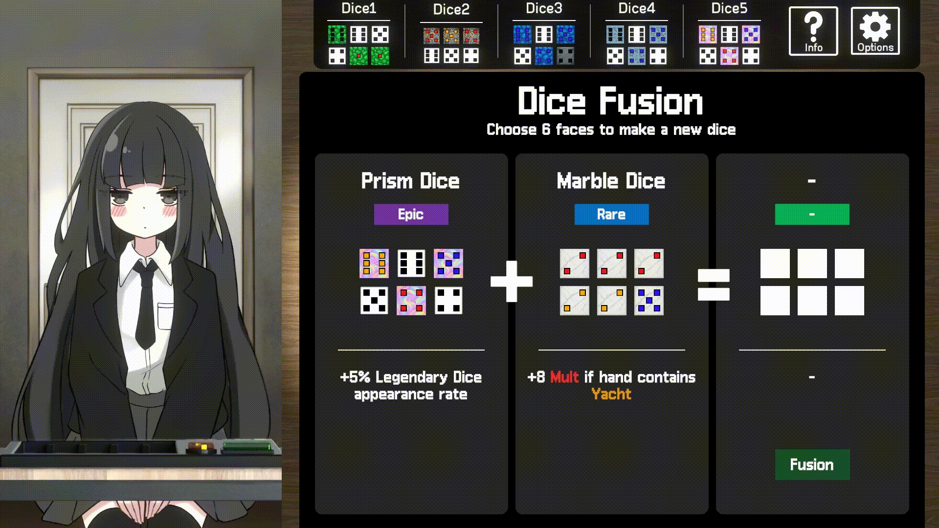 Newly acquired dice can be fused with one of your existing dice to create your own powerful custom die.