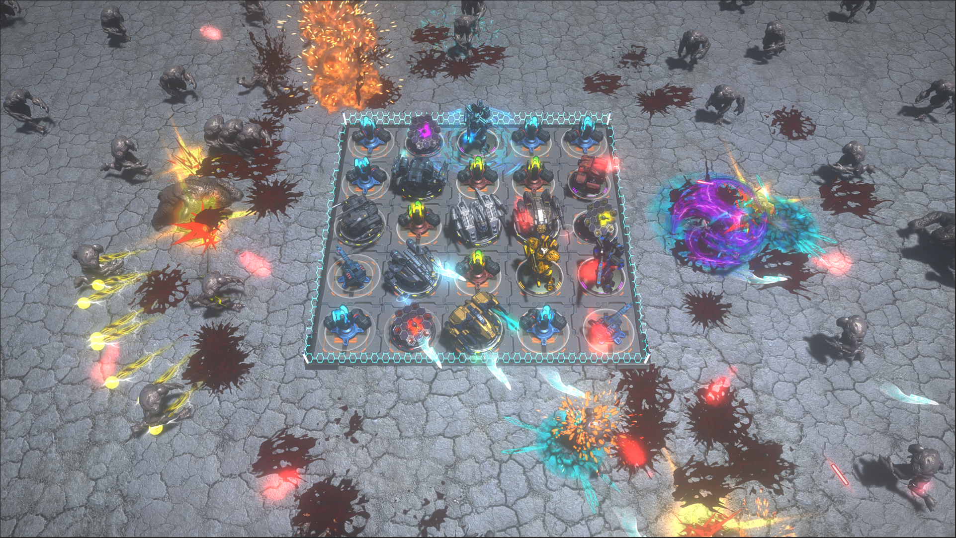 You can freely arrange your turrets on a 5x5 grid and unlock more turrets through battle.