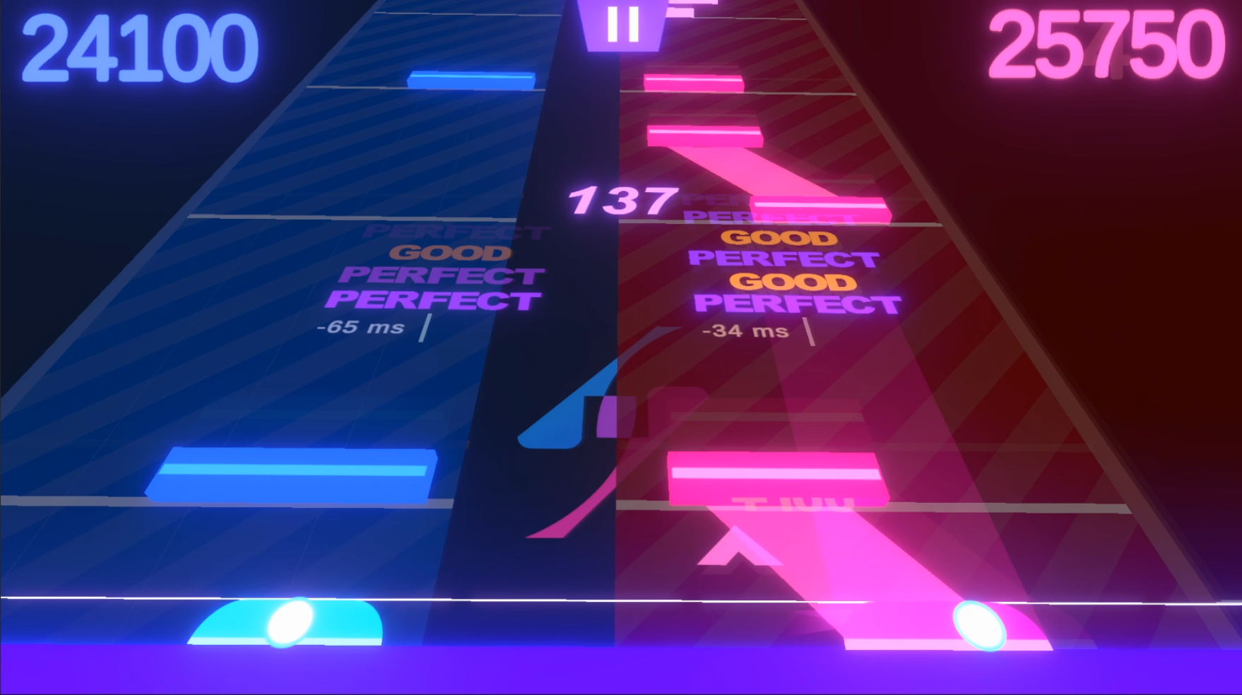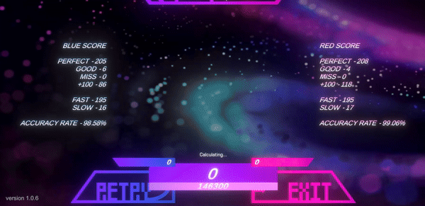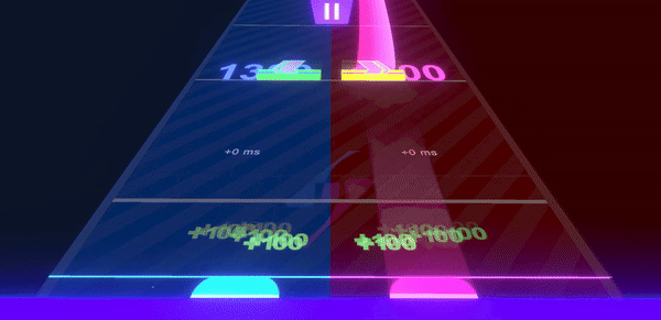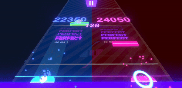 Project Split goes beyond simply dividing the screen into red and blue. The sound of the notes is separately heard through left and right audio channels, and the scoring system is divided into red and blue scores, fully utilizing the concept.