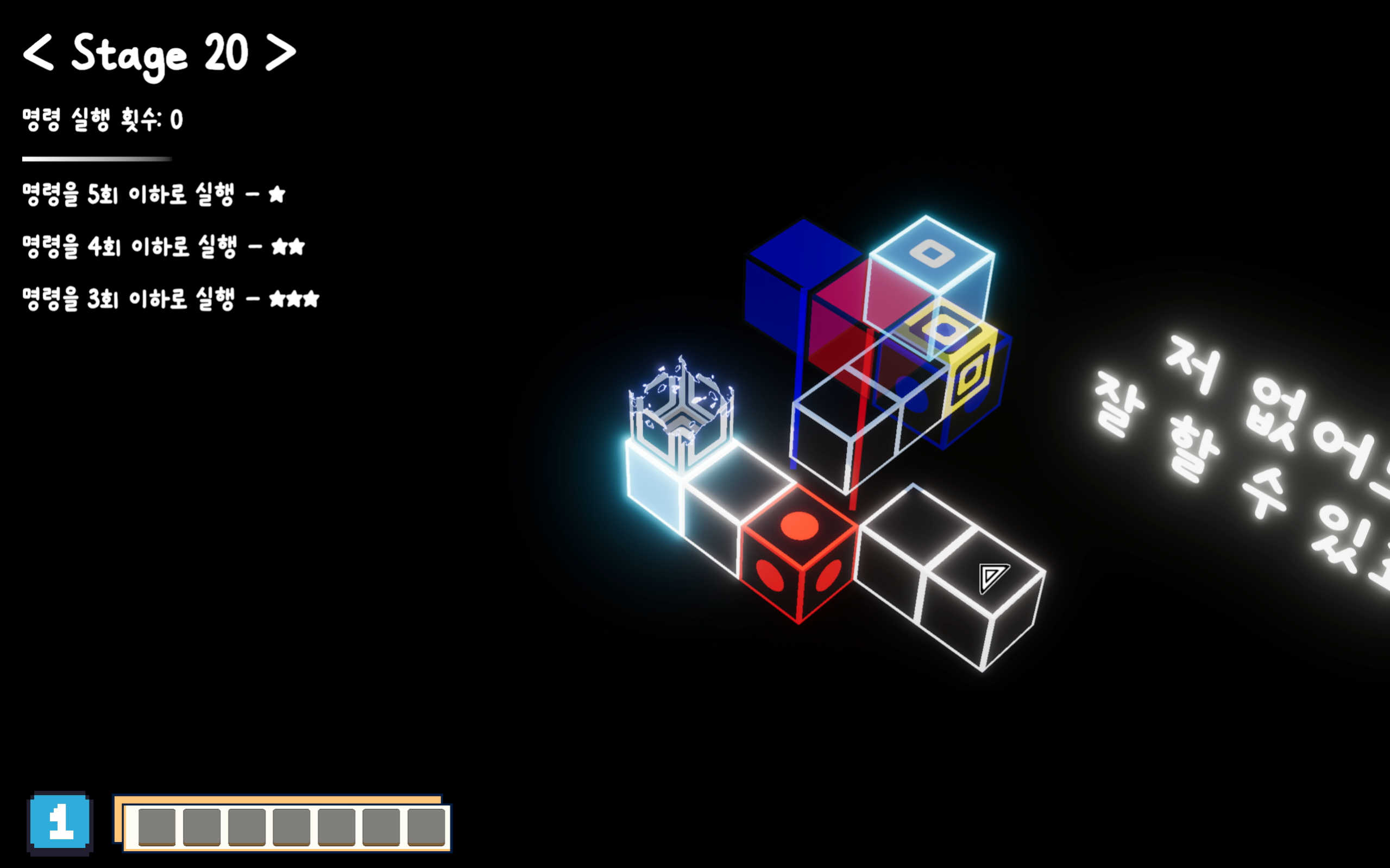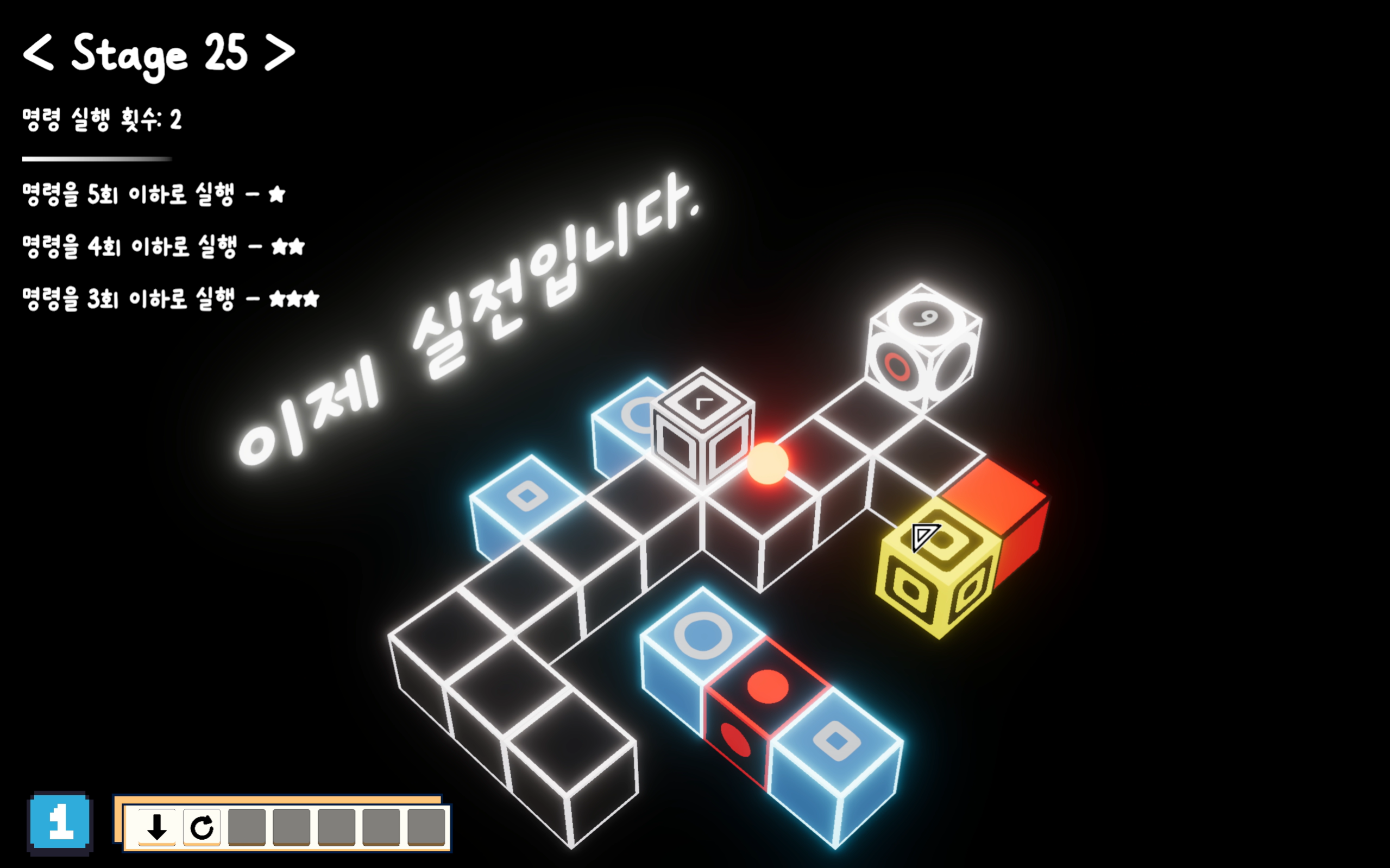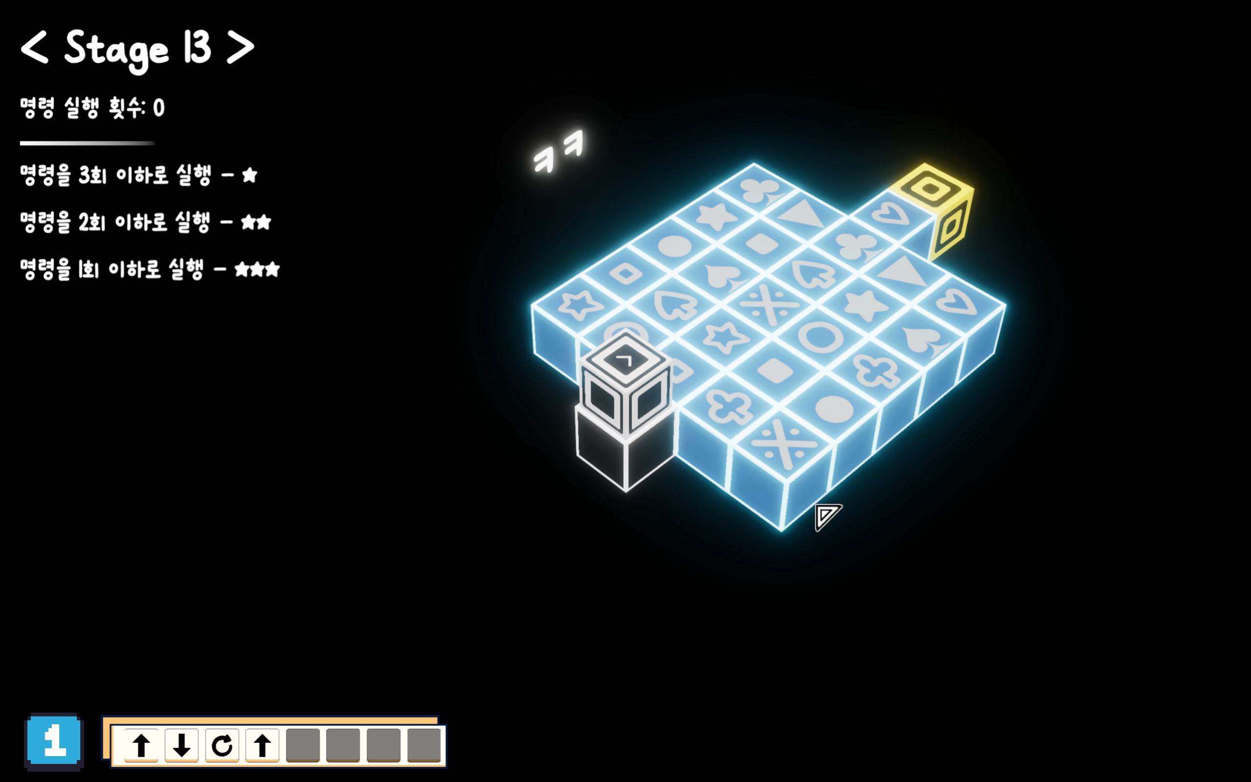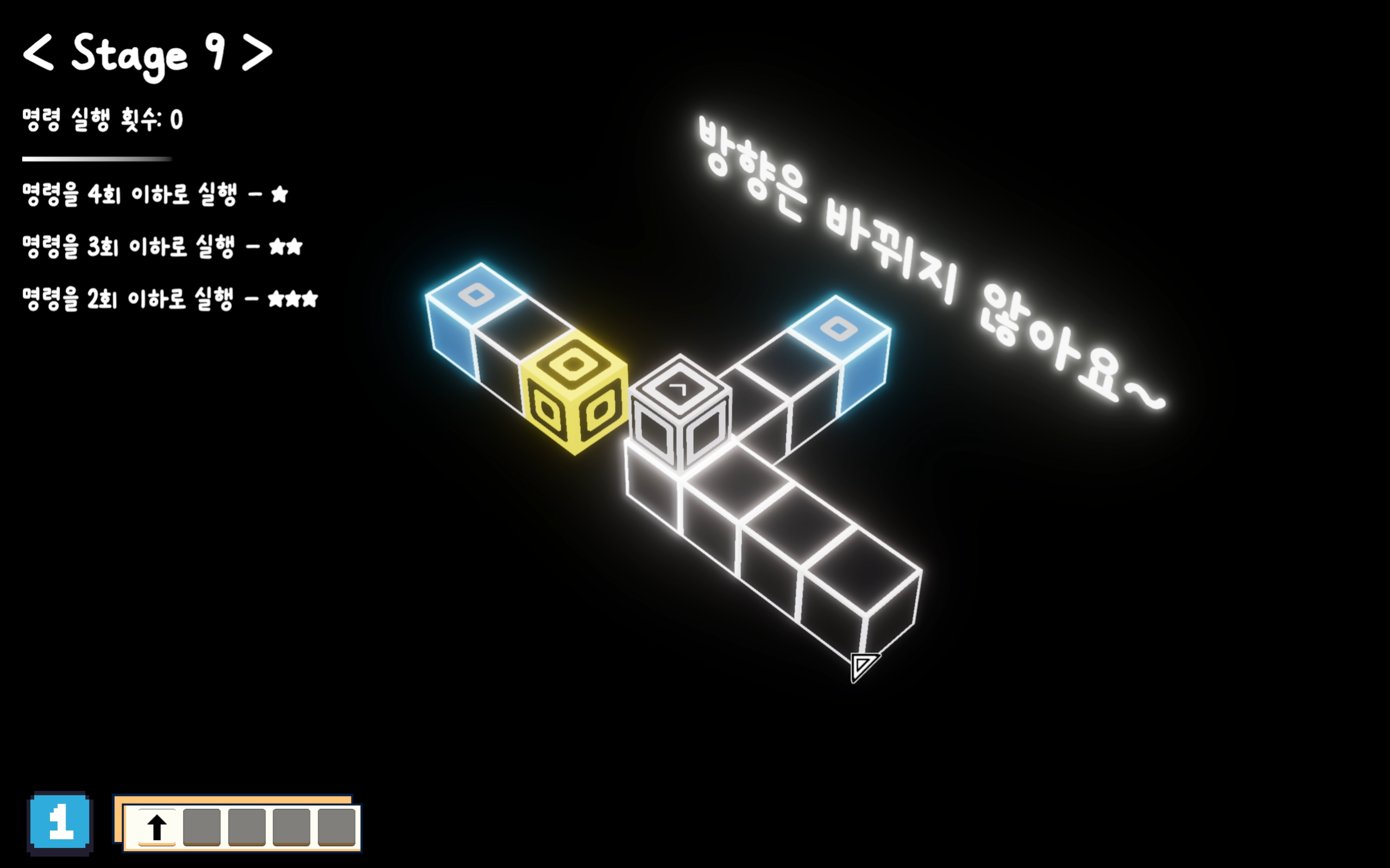 자신의 위치 변화를 포함한 주변 블록의 상호작용을 모두 예측해가며 행동을 구성해 최소한의 실행으로 도착지로 가는 간단한 퍼즐 게임 입니다.