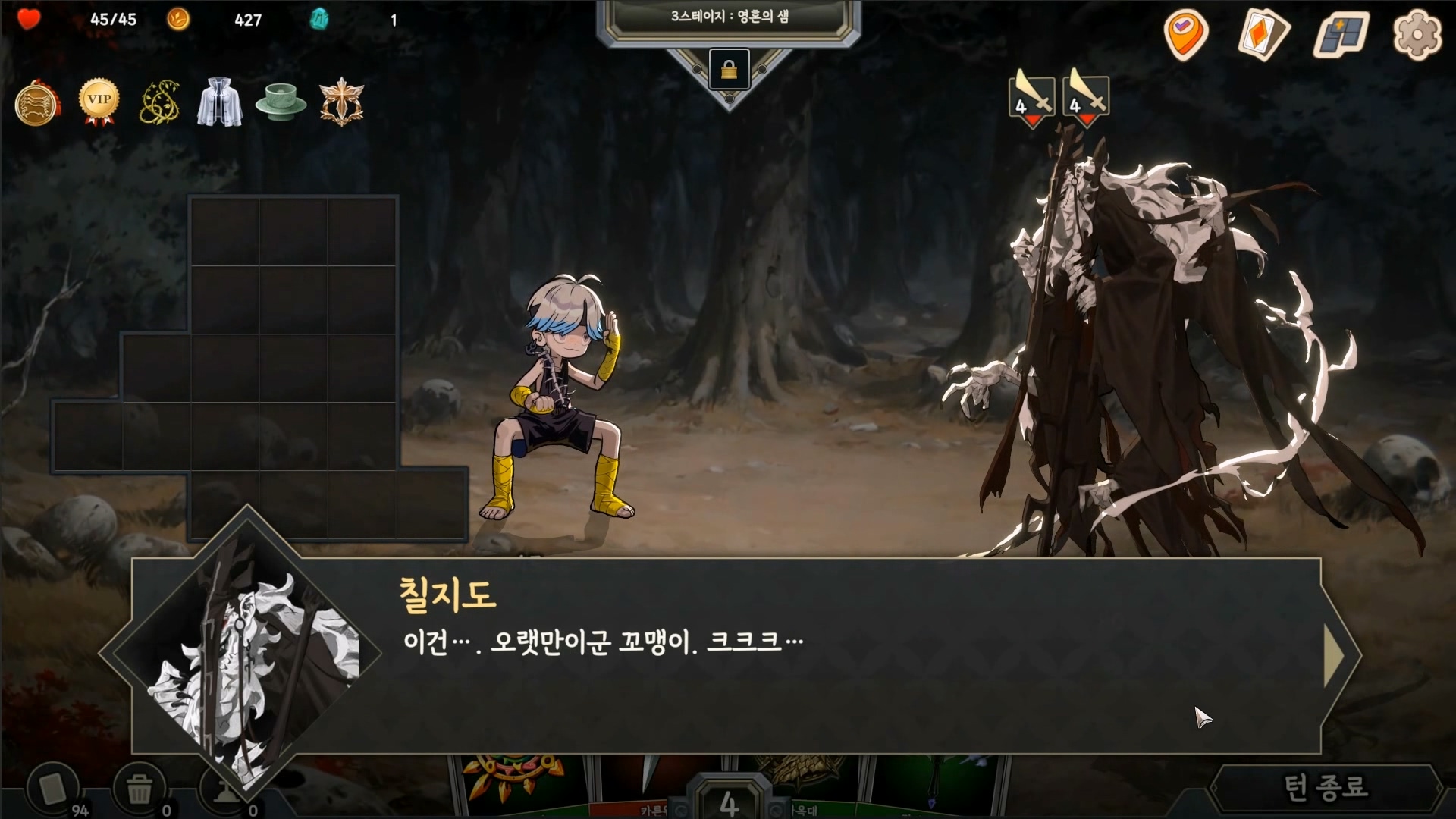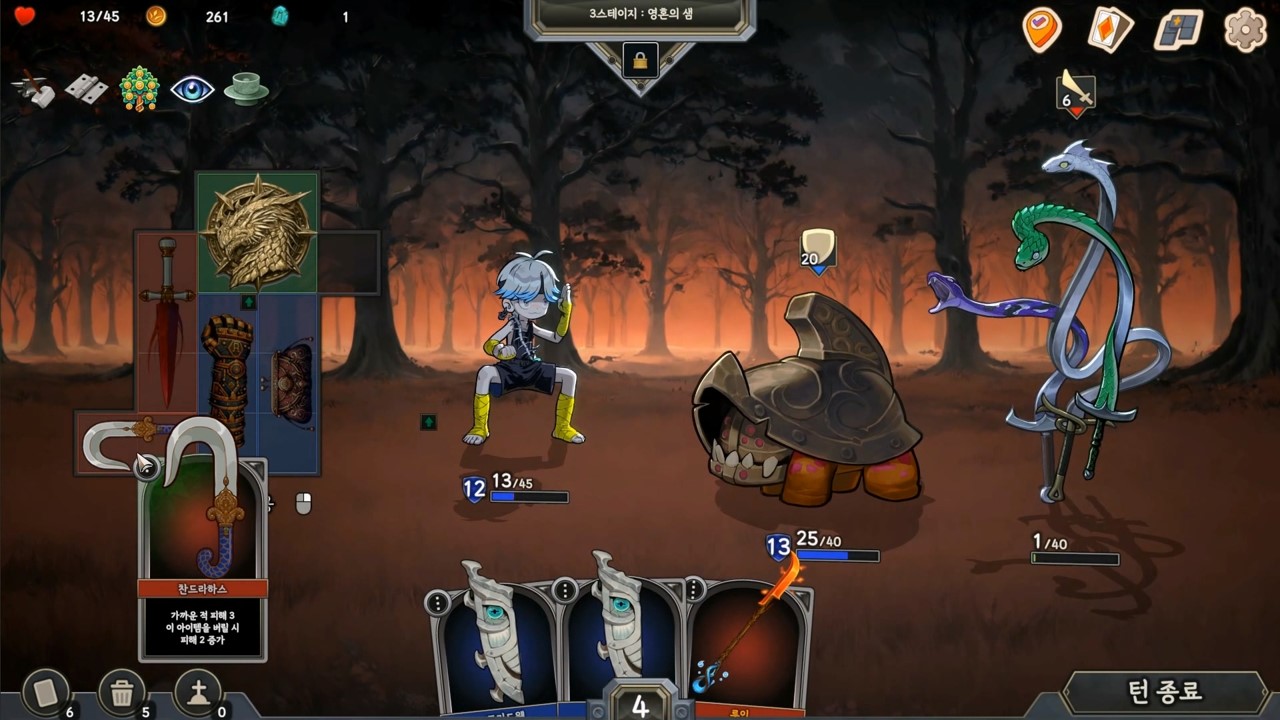 매 턴 카드 드로우를 하기 때문에 한번 인벤토리를 셋업하면 그 이후로는 지켜보기만 해야 하는 게임과는 다른 재미가 있습니다.