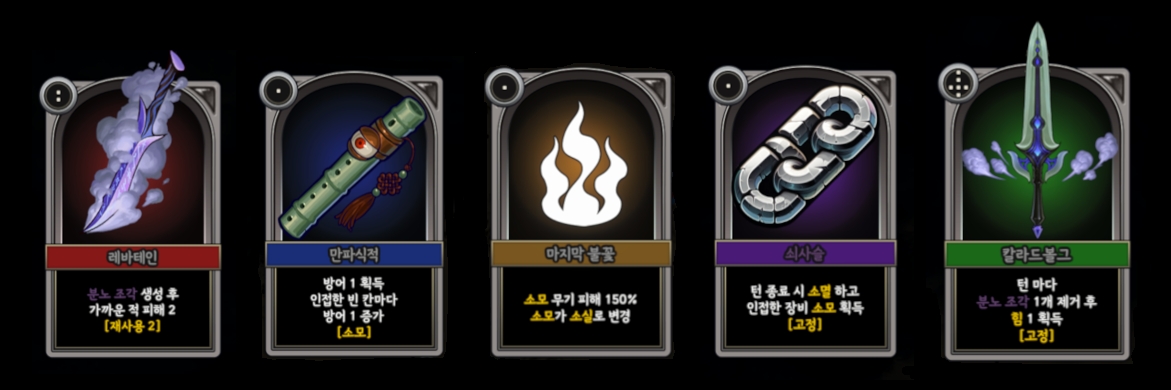 '인벤토리' 로그라이크 덱 빌딩 게임이라는 특성상,  각 카드들은 인벤토리 안에서의 위치와 주변상황, 유물에 따라 다른 능력을 발휘하게 됩니다.