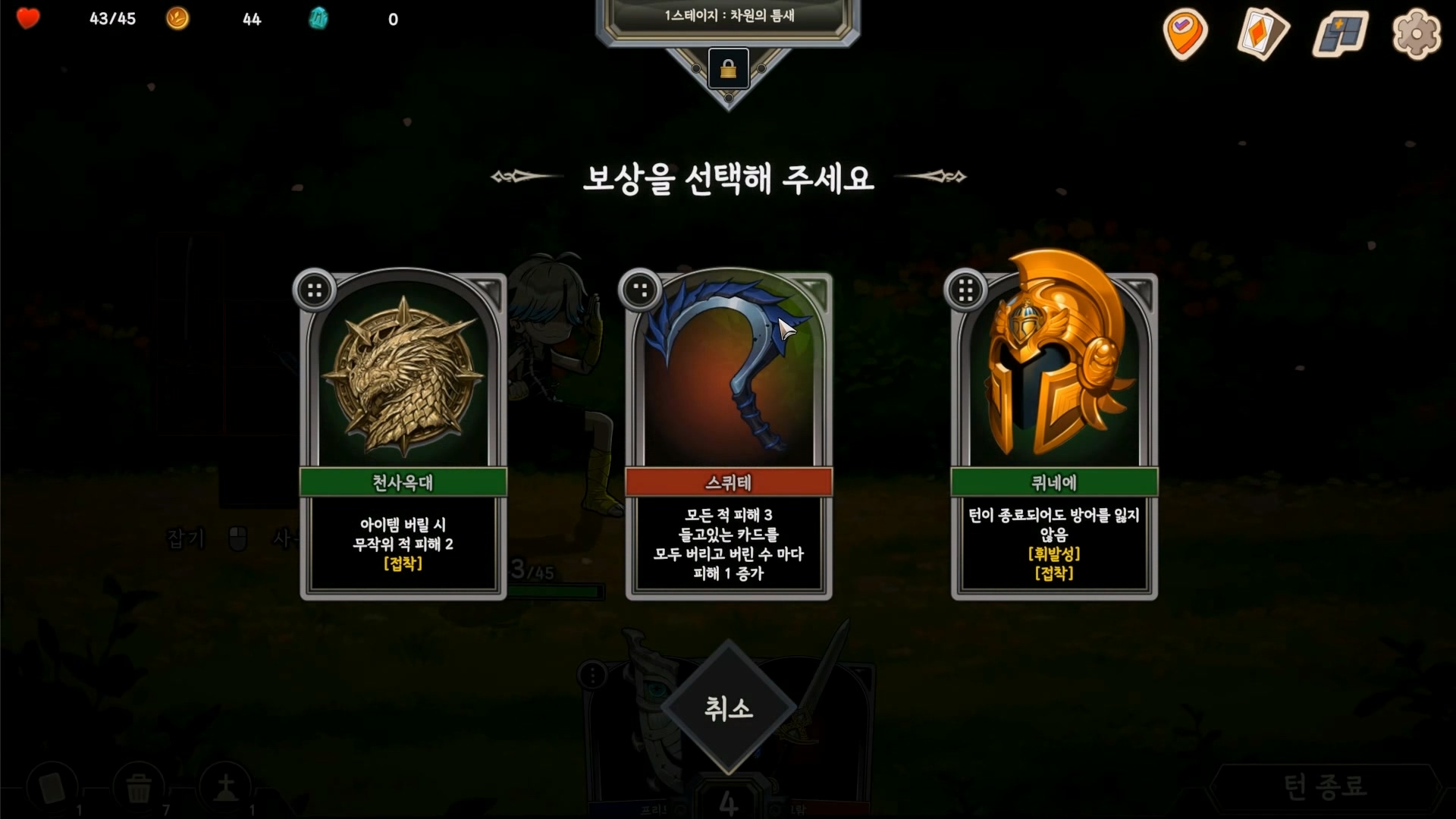 전투에서 이겨 나간다면 인벤토리 조각을 획득하여 인벤토리를 넓힐 수 있고, 카드를 추가로 획득 할 수 있습니다.