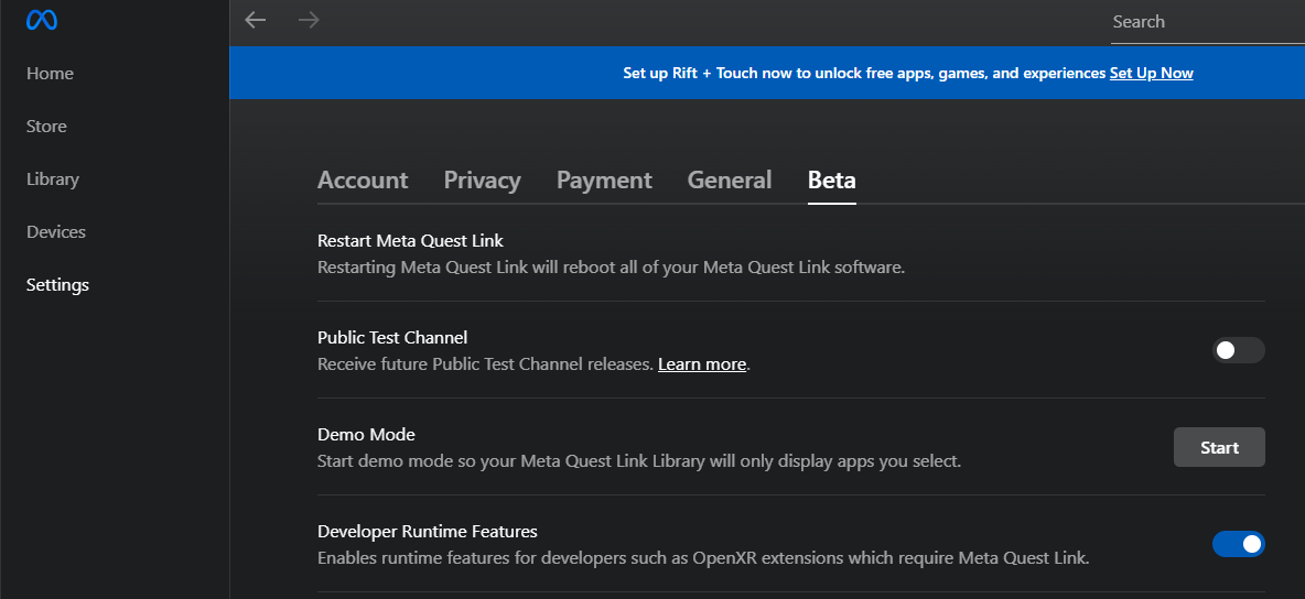 3. In Meta Quest Link, activate "Developer Runtime Features" under Settings → Beta.