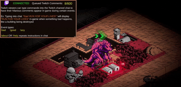 Twitch Integration - Twitch chat are the citizens! Twitch viewers can type commands into chat to have comments appear during certain in-game events