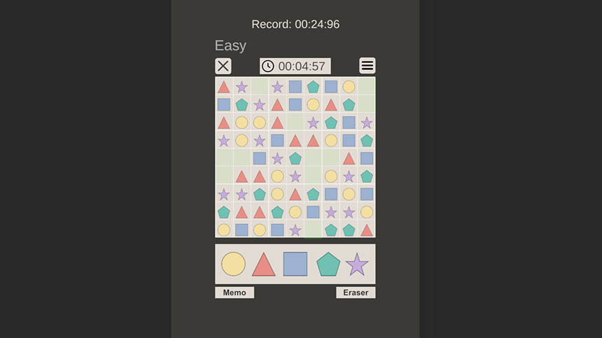 空のセルをクリックし、下部バーにある図形を押すことで進行が可能です。