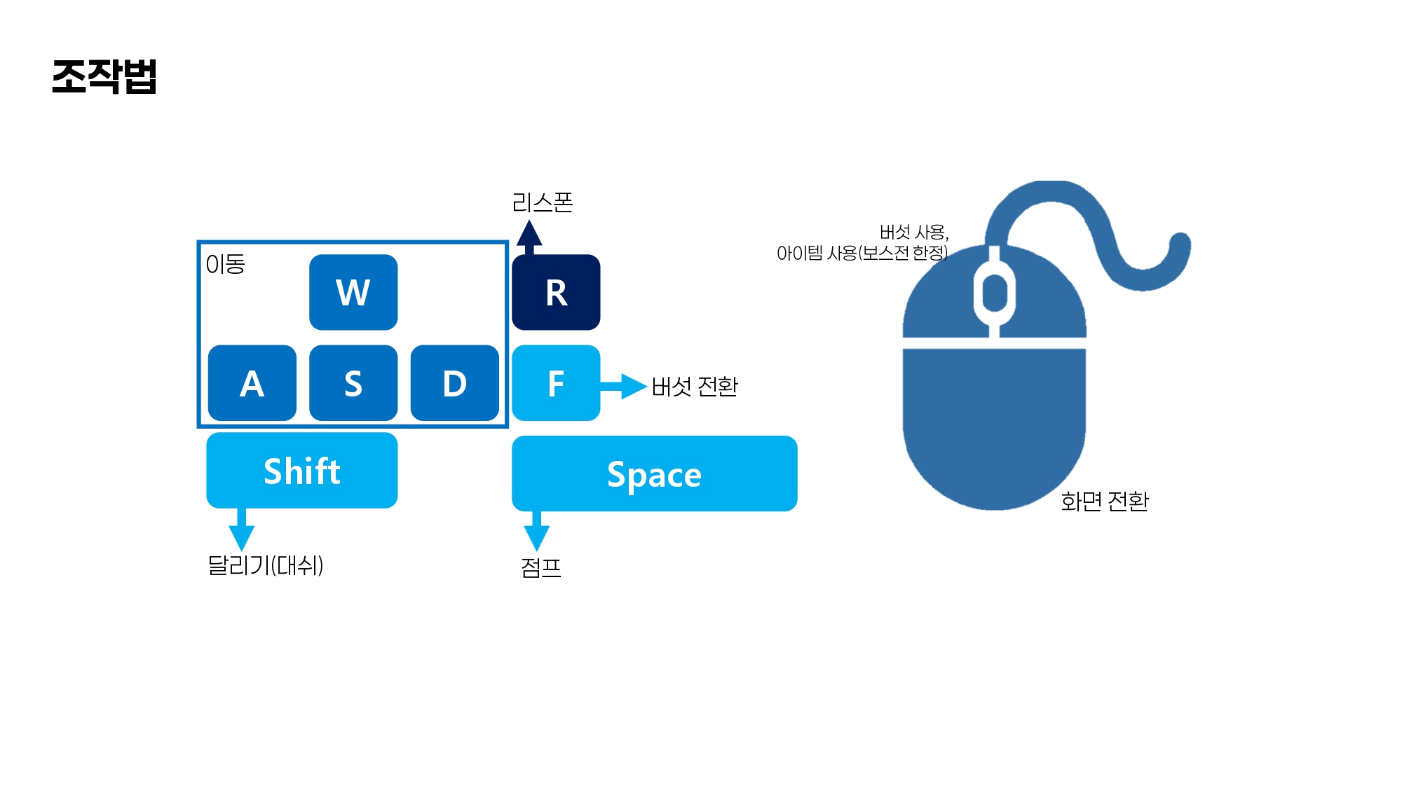 - 키보드(이동)와 마우스(아이템 사용)로 조작합니다.