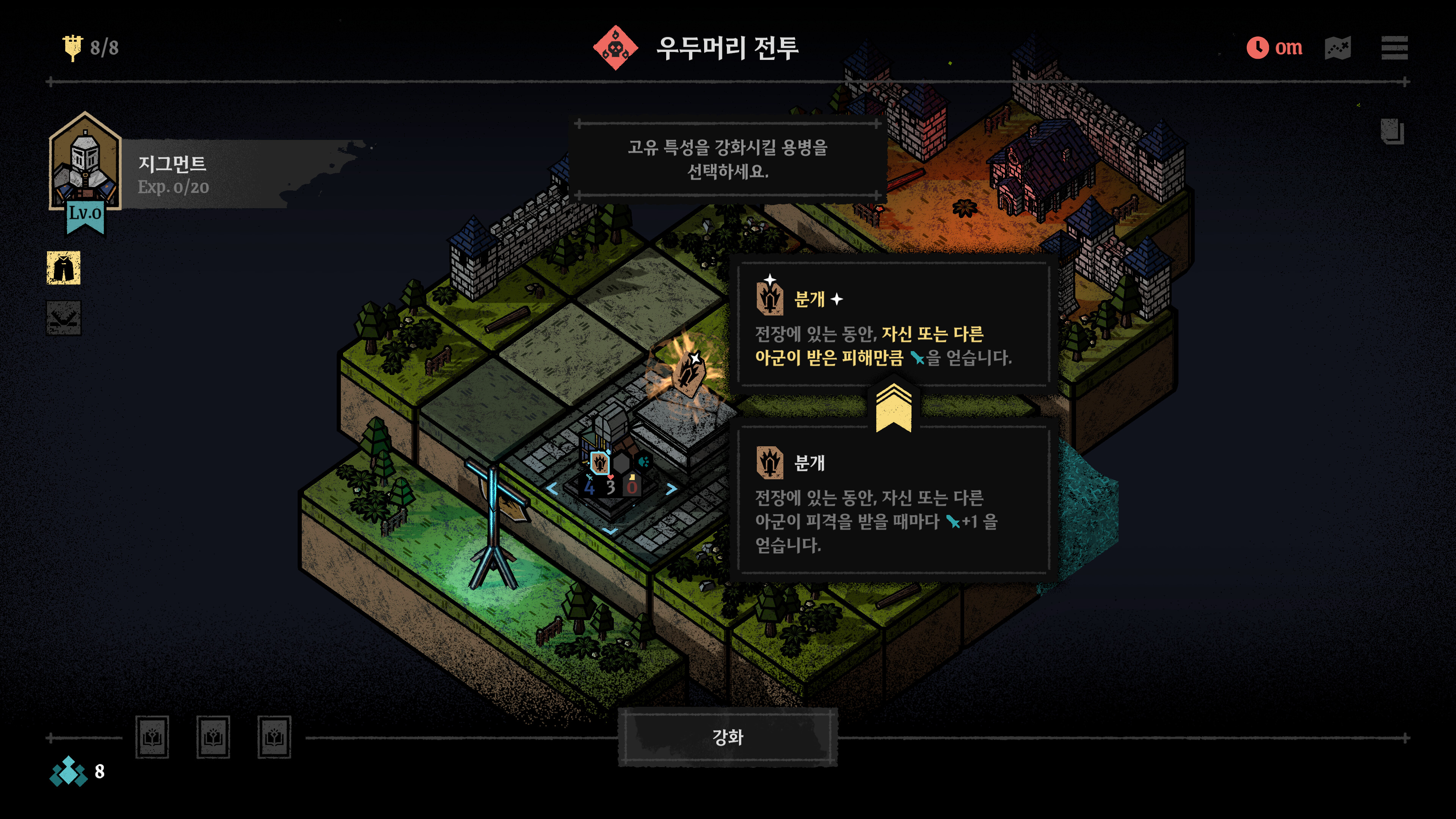 쓰라린 실패는 당신의 다음 원정의 밑거름이 될 것입니다. 실패한 원정에서 획득한 재화를 활용해, 전초기지에 시설들을 건설하세요. 건설된 시설들은 여정에서 사용할 수 있는 아이템의 횟수를 늘려주거나, 획득하는 용병들을 강화하는 등, 다양한 방식으로 당신의 여정을 도울 것입니다.