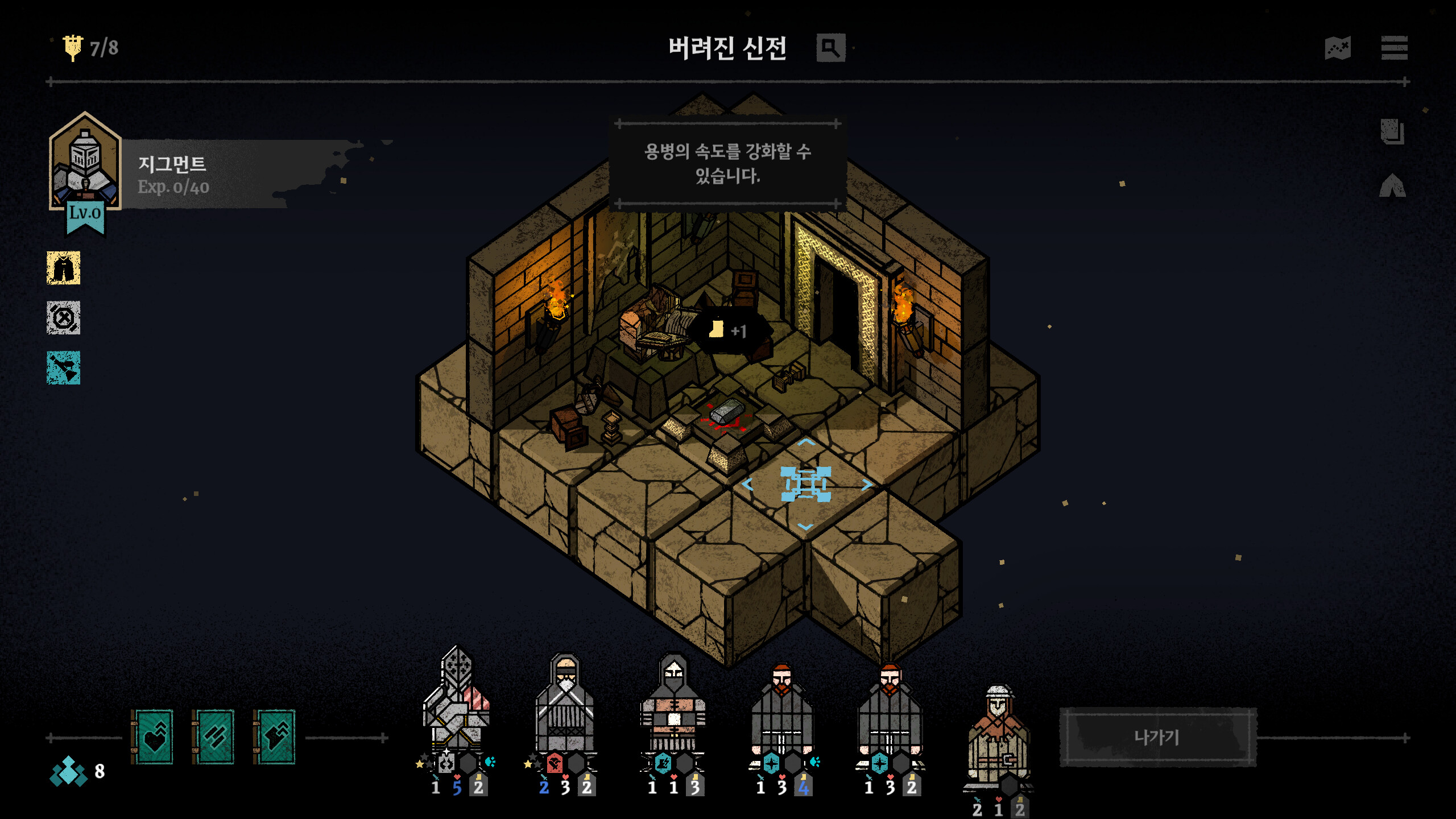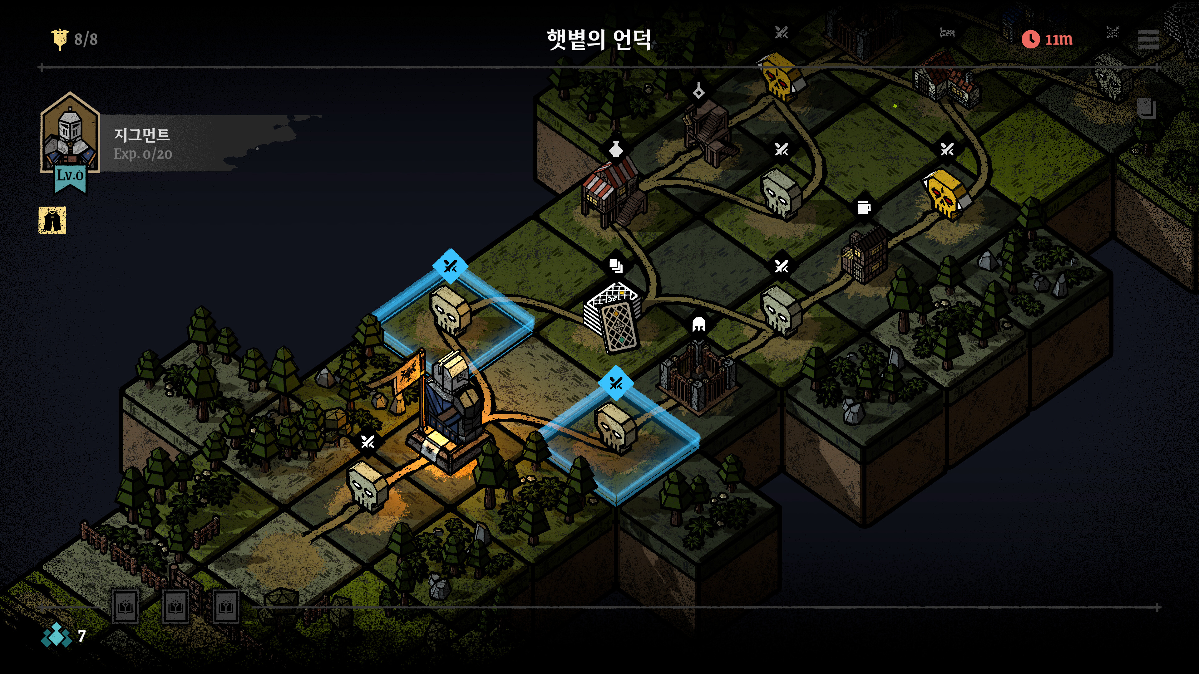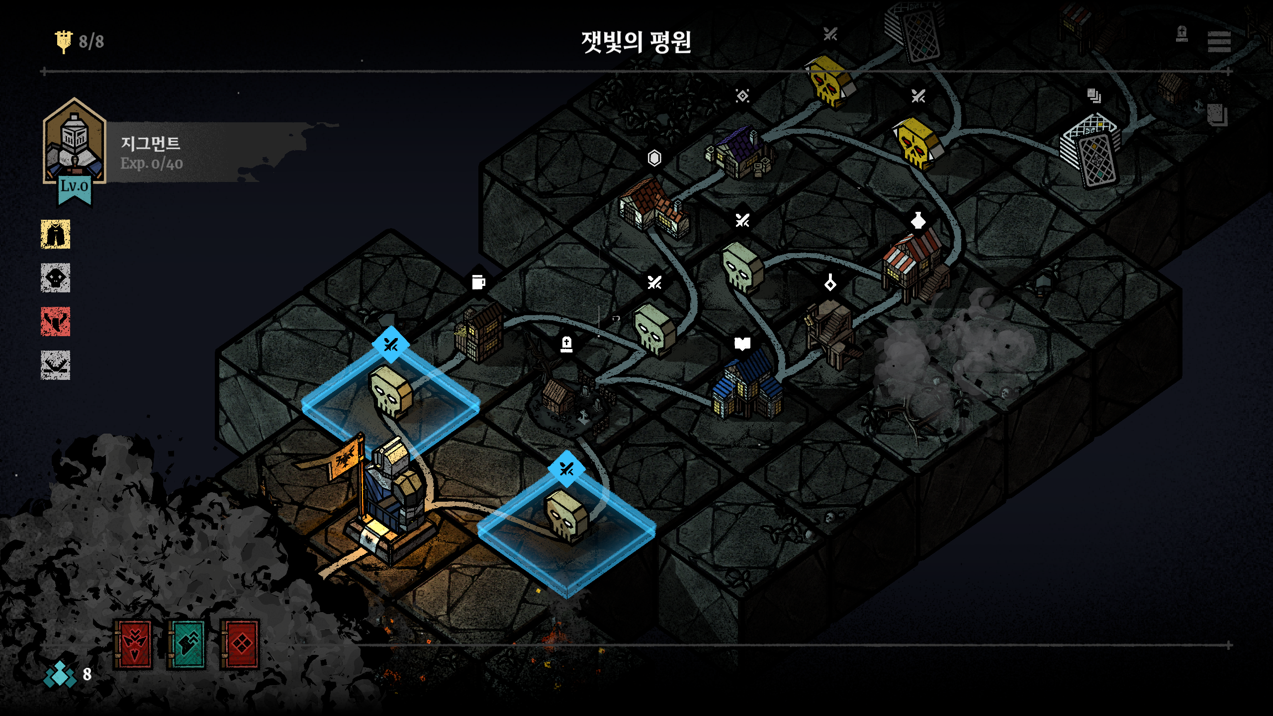 각 지역에 있는 다양한 건물에 방문하여, 강력한 악의 무리들과 맞서 싸우기 위해 더욱 강해져야 합니다. 용병의 특성을 조합하거나, 필요없는 용병을 원정대에서 추방하고, 유물과 아이템을 구입하여 앞으로의 전투에 대비하세요.