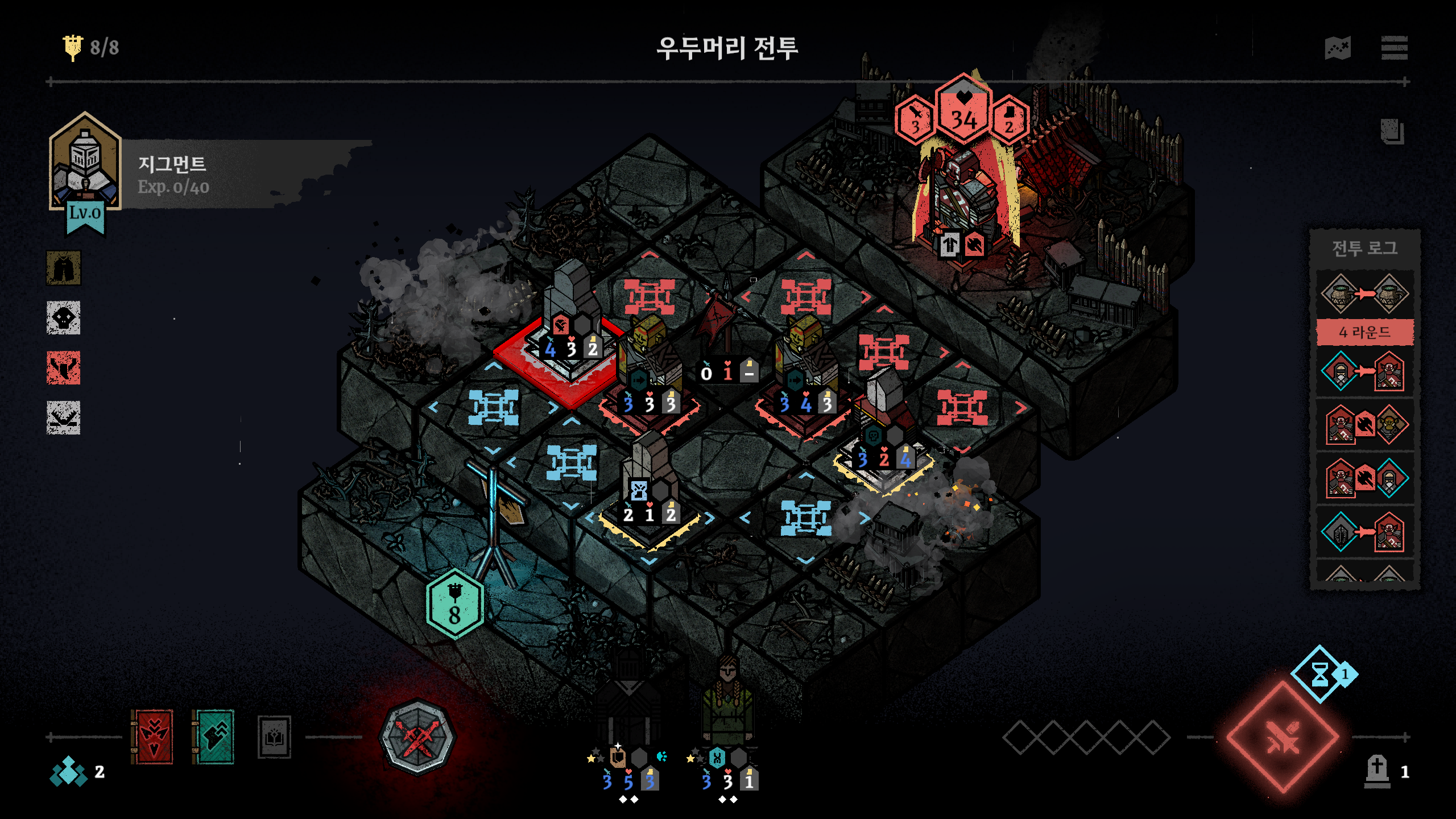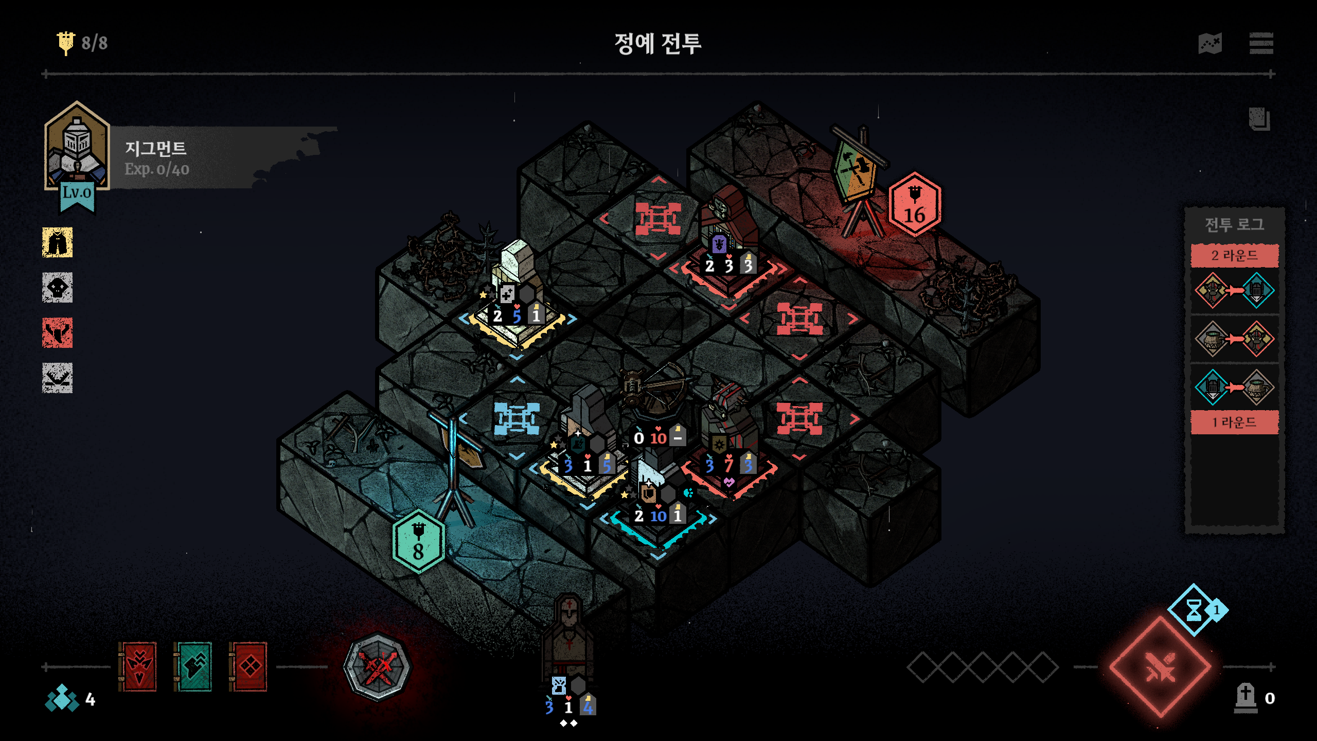 매 라운드마다 주어지는 행동력을 소모하여, 용병을 전장에 배치해 전투를 진행합니다. 전투가 시작되면 용병들은 각자의 속도에 따라 순차적으로 행동하니, 배치 단계에서 최적의 수를 찾아 용병들을 적절한 위치에 놓아보세요.