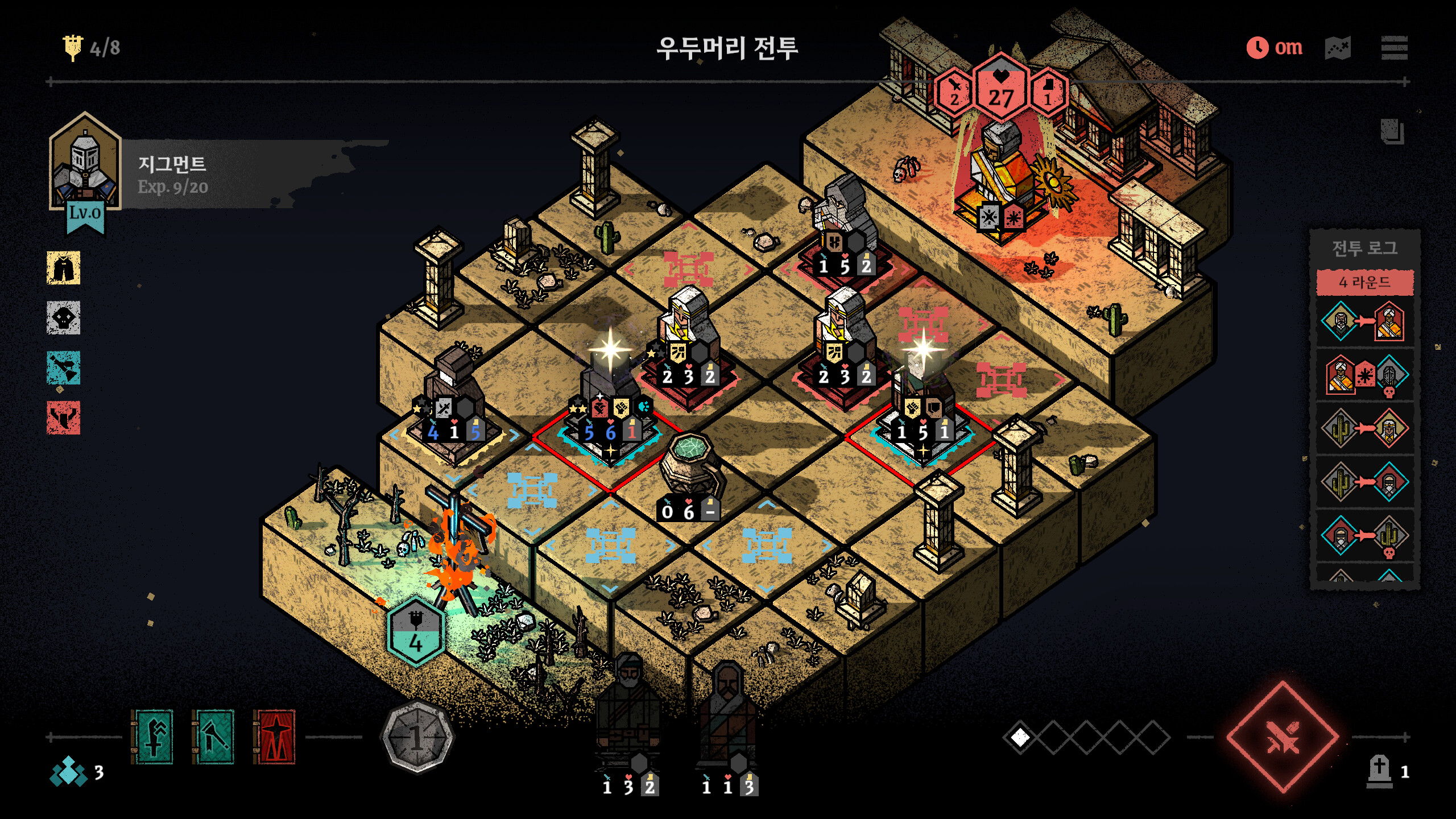 전투는 각자의 능력치에 따라 결과가 예측되는 간단한 구조의 자동 전투로 진행되지만, 최적의 수를 찾기 위해서는 전투에서 발휘되는 용병들의 특성, 장애물, 깃발 체력, 상태이상 등, 여러가지 요소를 종합적으로 고려한 판단이 필요합니다. 한 번의 잘못된 판단이 전장의 흐름을 바꿀 수 있으니, 신중히 결정하세요!