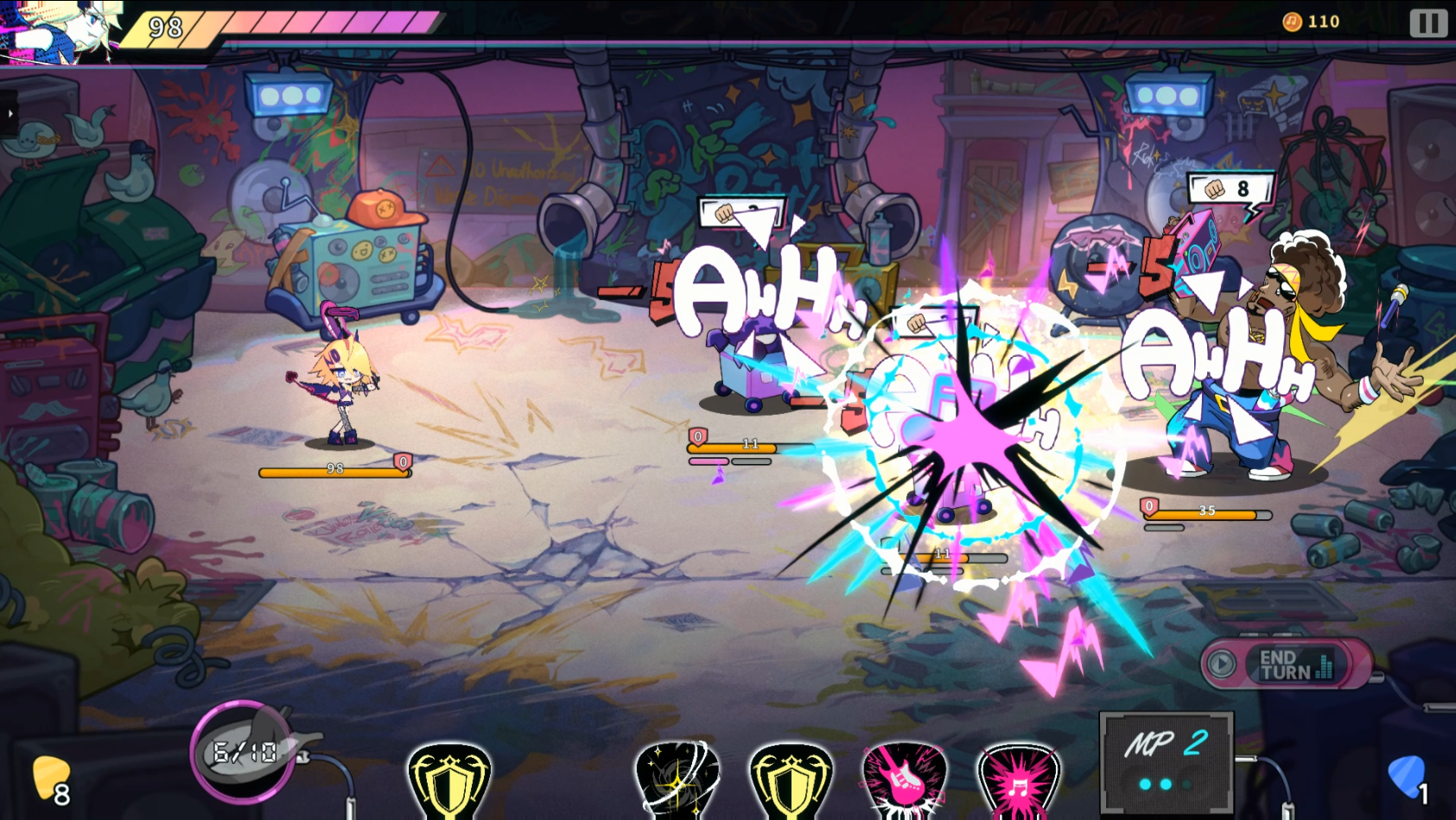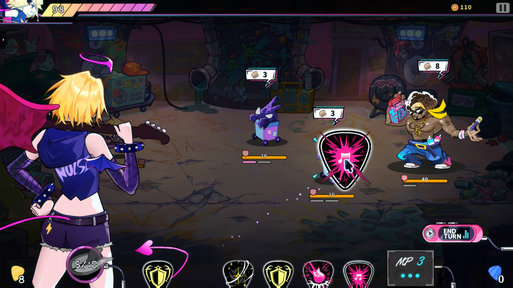 피끗?삐끗!은 기타 피크 형태의 카드를 사용해 적들을 물리치며 스테이지를 돌파하는 전략 카드 게임입니다.