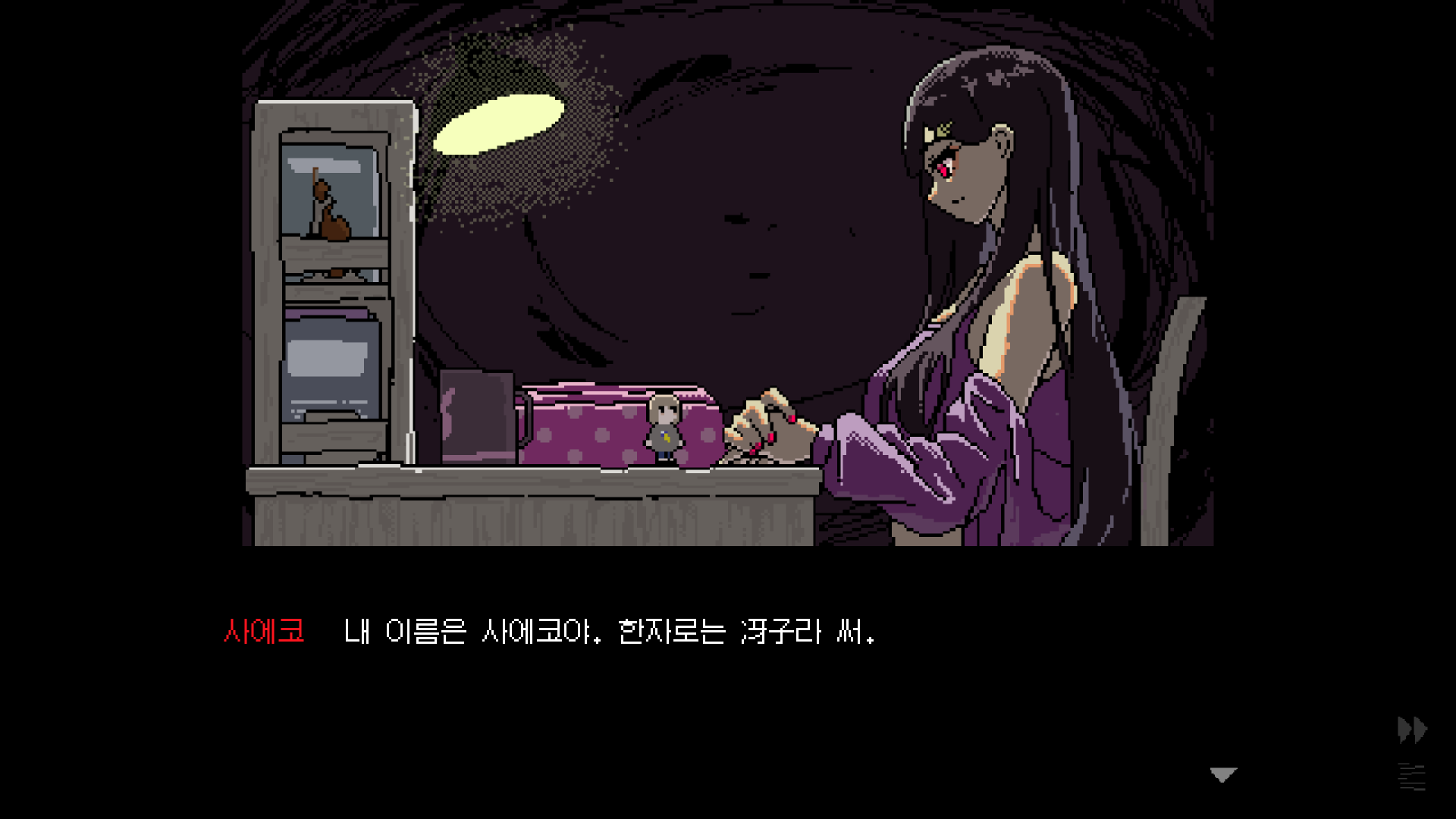 '밤' 파트가 되면, 서랍에서 나와서 사에코의 말동무를 하게 됩니다. 그녀의 소소한 잡담에 맞춰 '네' '아니오' 등으로 대답해주세요.