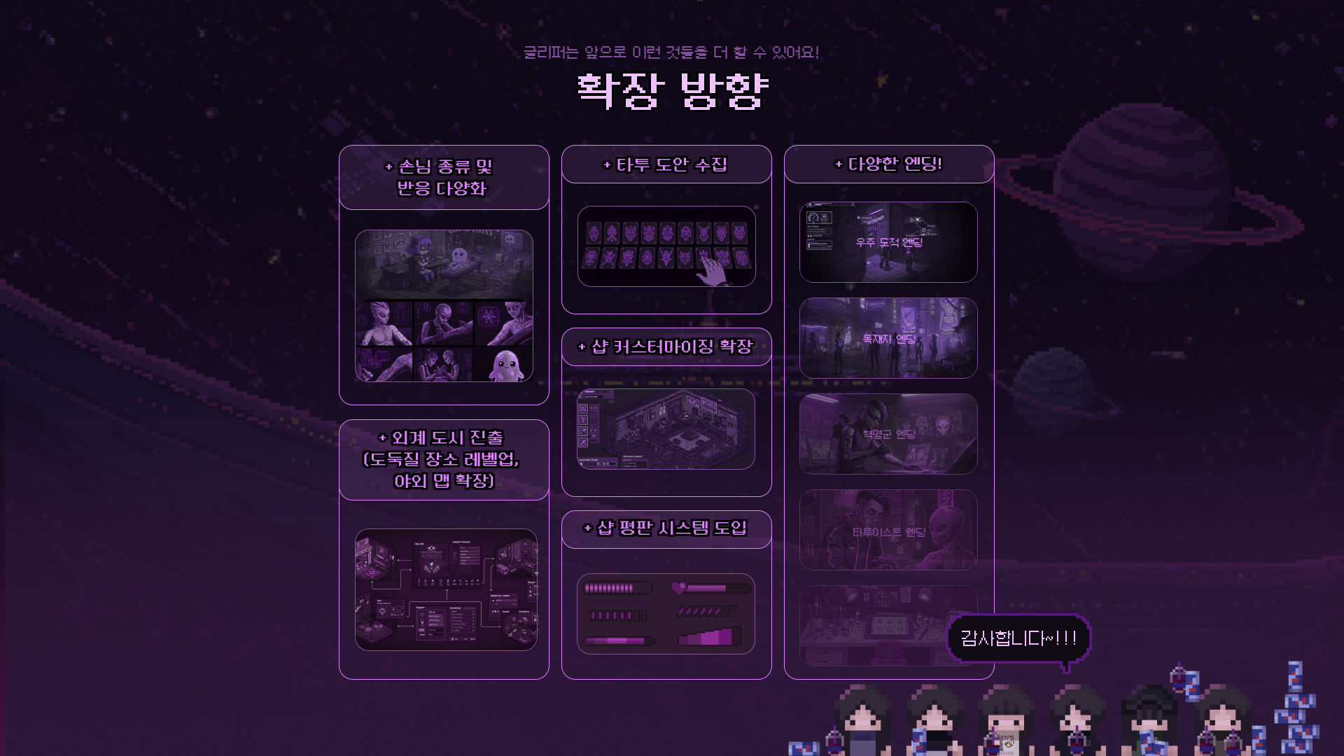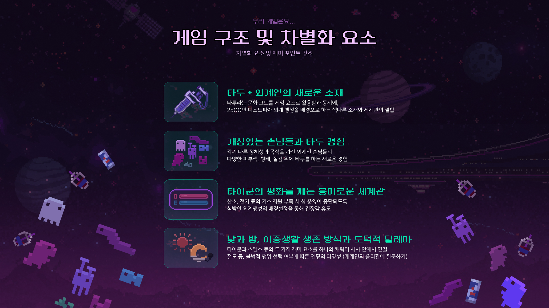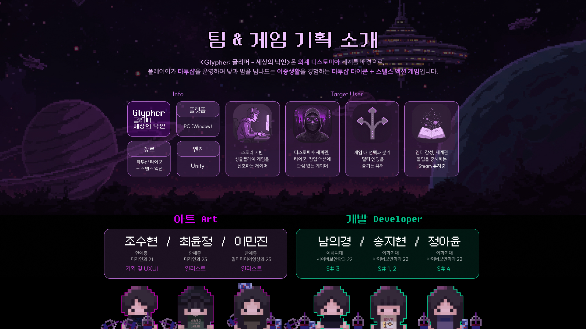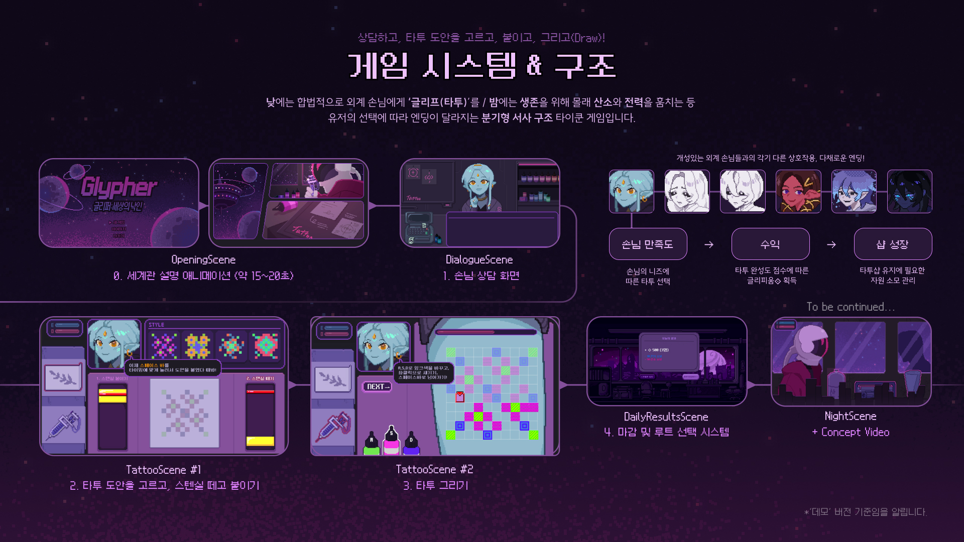 2025 UNICON 특별상 수상! <Glypher: 글리퍼 – 세상의 낙인>은 외계 디스토피아 세계를 배경으로, 타투샵을 운영하며 낮에는 합법적으로 외계 손님에게 ‘글리프(타투)’를, 밤에는 생존을 위해 몰래 산소와 전력을 훔치는 등 유저의 선택에 따라 엔딩이 달라지는 분기형 서사 구조의 아케이드 퍼즐 + 타이쿤 + 스텔스 액션 게임입니다.