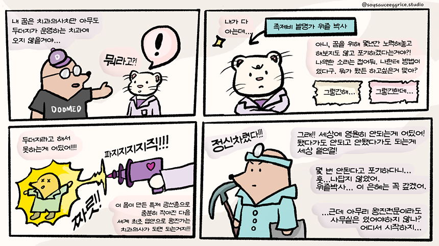 두더지 치과의사, 족제비 발명가, 회색곰 상점 주인을 주축으로 펼쳐지는 우당탕탕 치과 개원기!