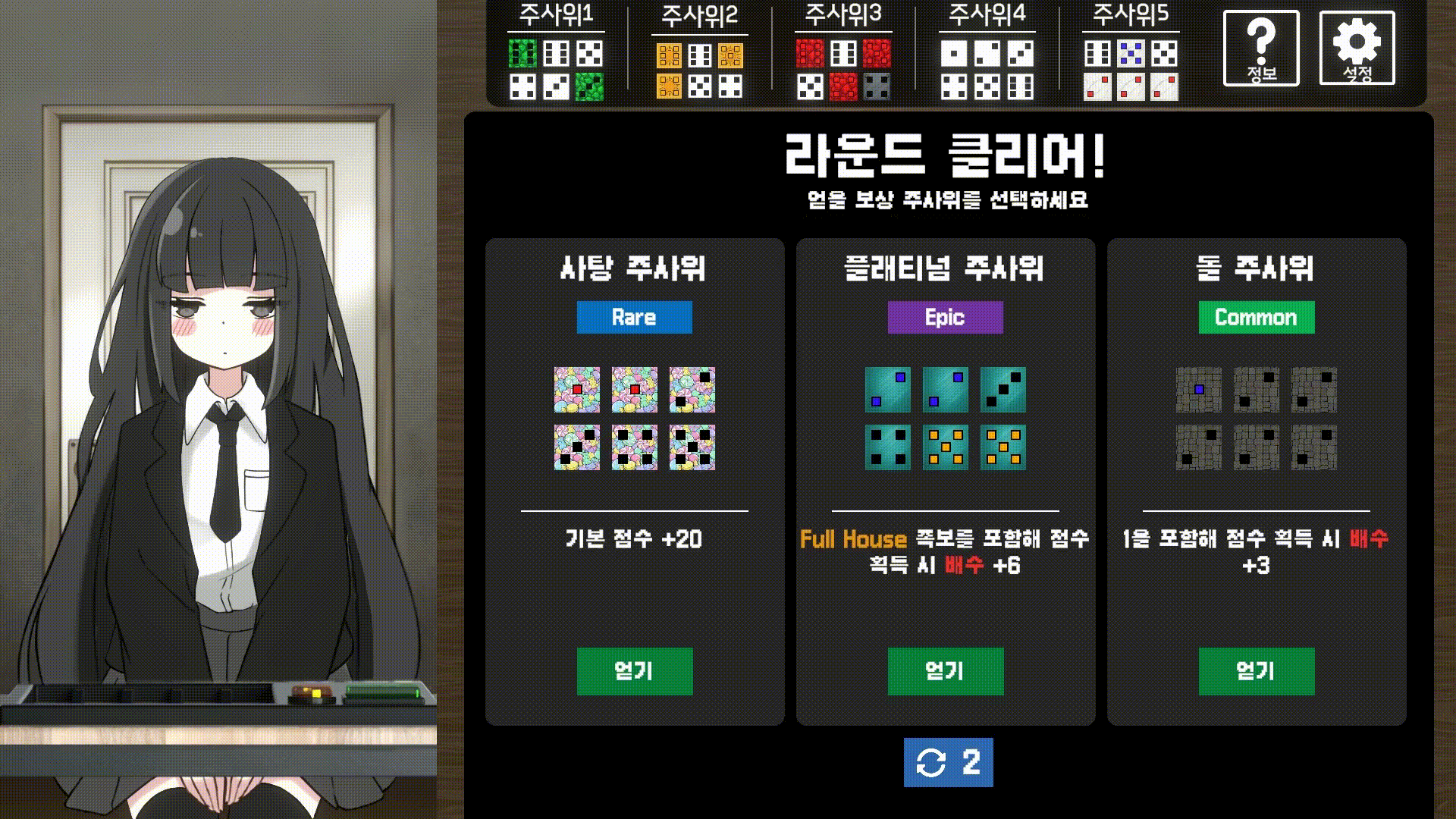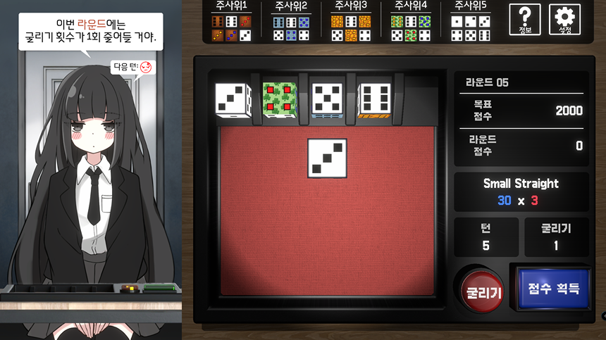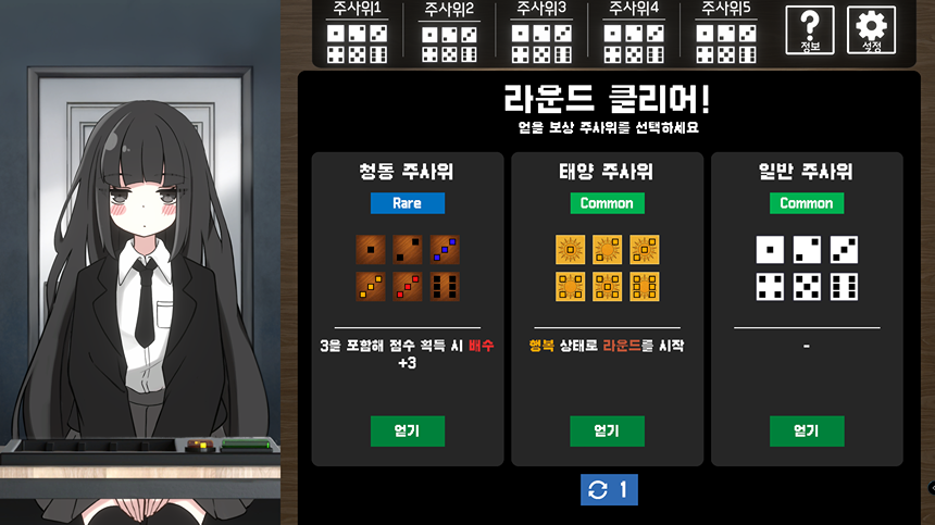 라운드를 클리어할 때마다 특별한 능력을 가진 주사위를 얻을 수 있습니다.
