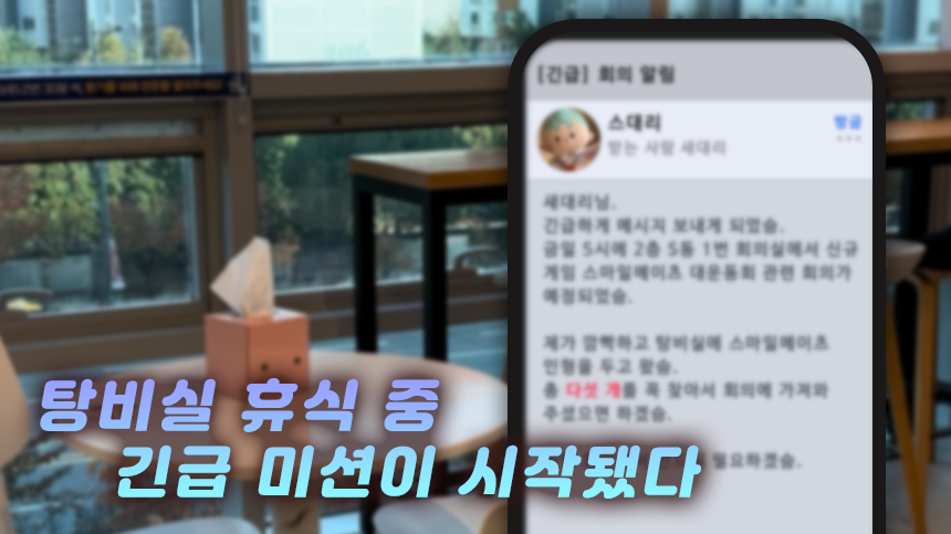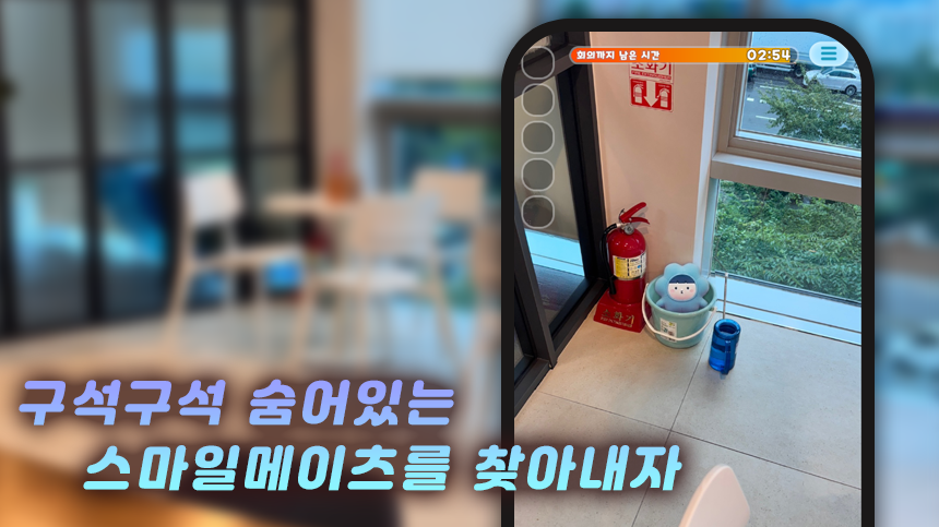 회의 시작 3분전, 탕비실에 흩어진 스마일메이츠를 모두 찾아 회의에 참석해야 하는 게임입니다!