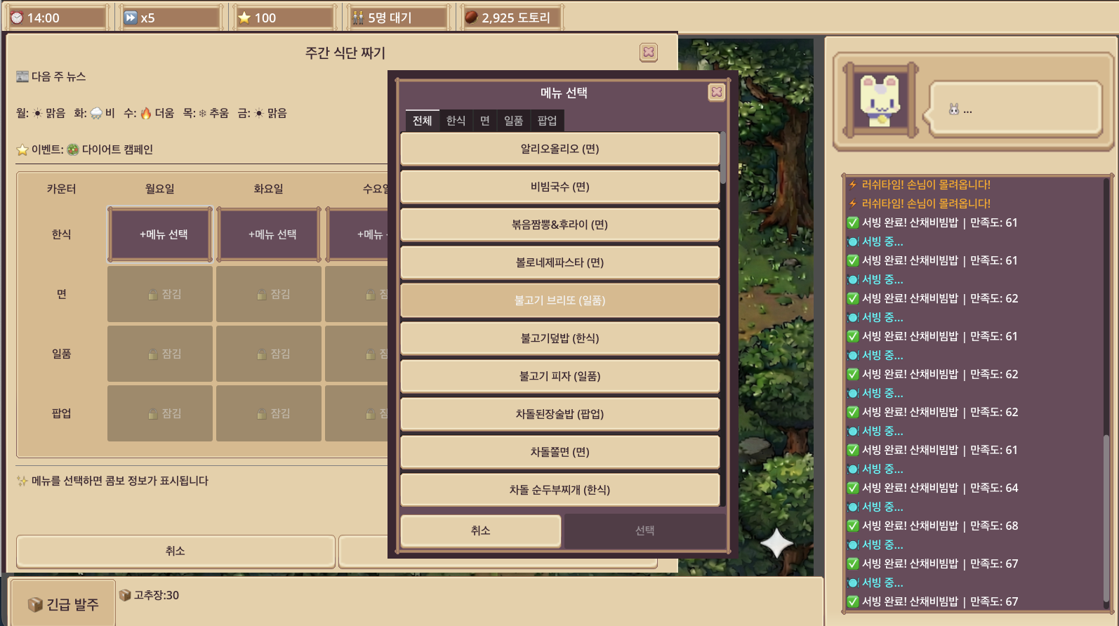 스트레스 받은 숲속 동물들이 찾아오는 힐링 레스토랑을 운영하세요!매주 날씨와 이벤트를 고려해 메뉴를 기획하고, 손님들에게 맞춤 요리를 제공하는 전략 경영 시뮬레이션입니다.