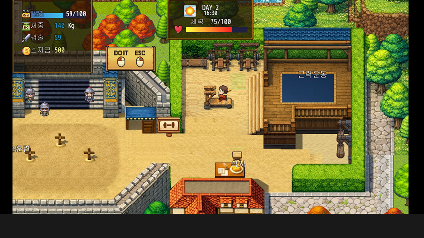 - 식사를 할 경우 '칼로리' 를 얻으며, 과잉 칼로리는 체중으로 전환됩니다. 체중이 너무 많을 경우 패배하므로 운동을 통해 감량하는 게 포인트입니다.