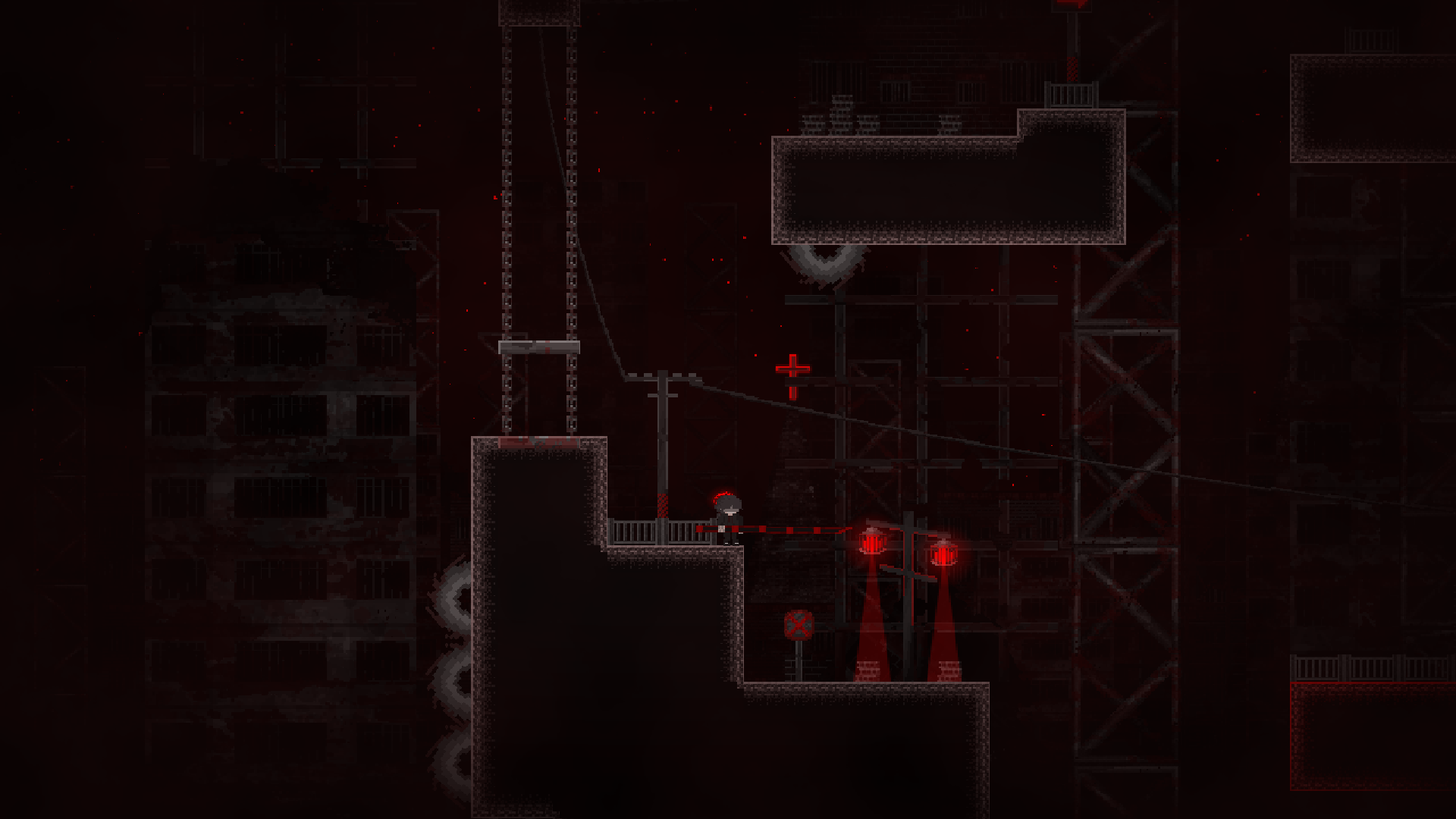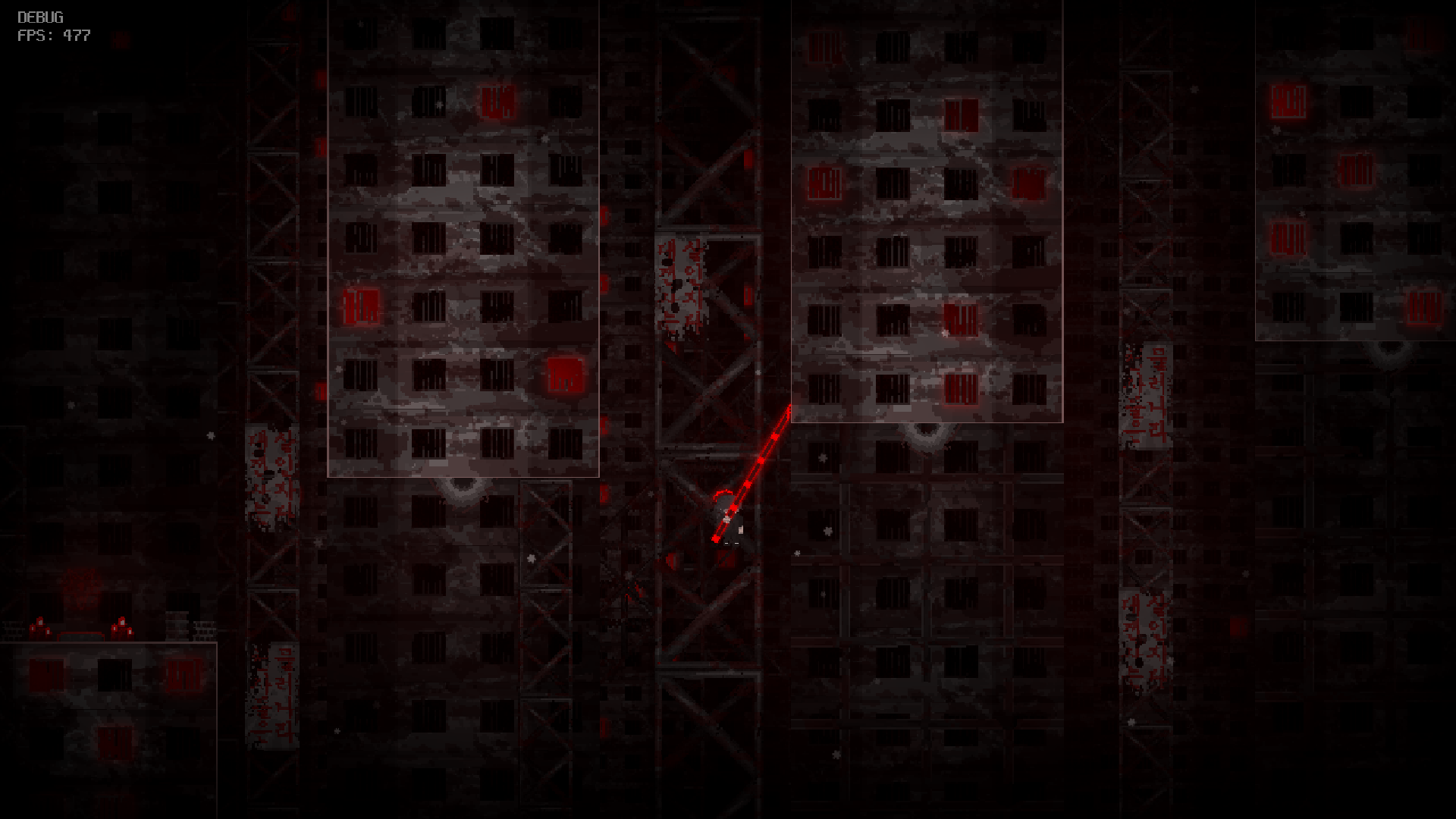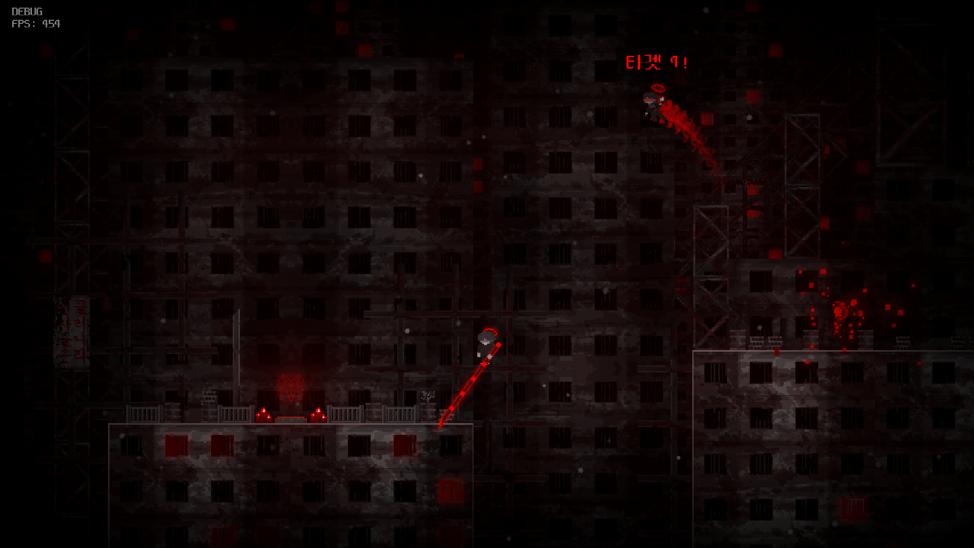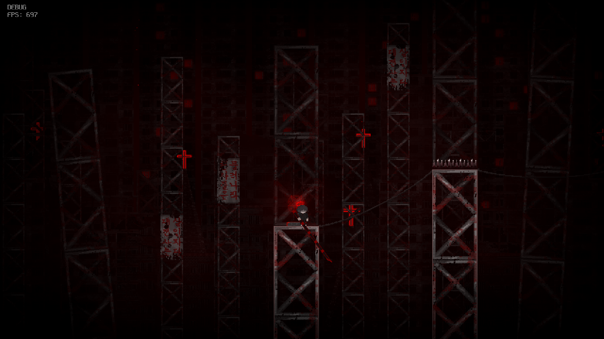 ‘천사의 난’에서 가장 중요한 요소이자 가장 중심이 되는 이동 방식은 ‘고정’입니다. 주 무기인 죽창을 벽이나 천장, 바닥에 고정할 수 있고, 고정 상태에서 점프하면 죽창이 꽂힌 반대 방향으로 가속도를 받을 수 있습니다. 이를 통해서 더 높게 점프하거나, 벽을 타거나, 천장에 매달려 이동할 수 있습니다. 또한 고정이 가능한 벽과 고정할 수 없는 벽이 존재합니다. 따라서 플레이어는 죽창을 어디서 어떻게 고정해서 앞으로 진행해야 할지 생각해야 합니다.