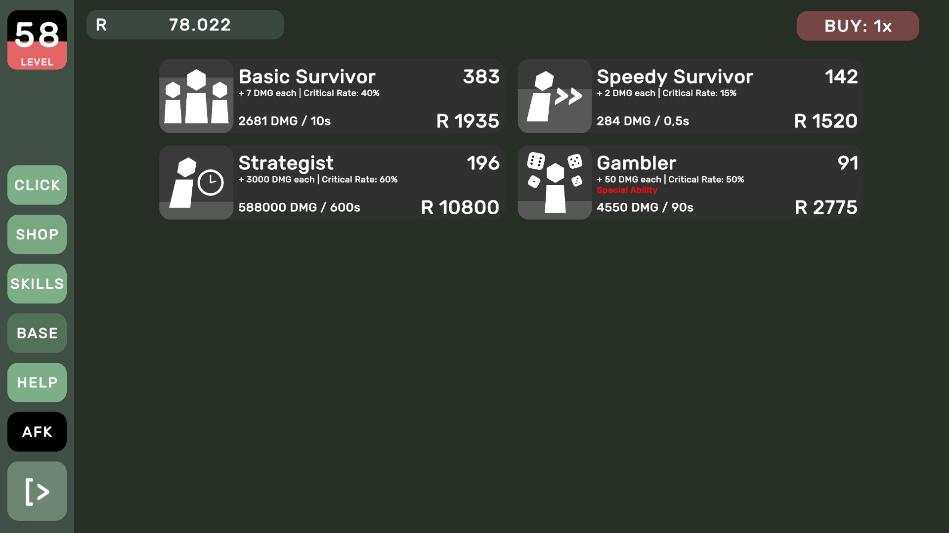 Idle Undead는 생존자들을 모집하고 다양한 업그레이드를 구매하여 게임을 진행하는 클릭커 게임입니다. 화면을 클릭하여 포인트를 획득하고, 이 포인트를 사용하여 동료 생존자들을 모집하고 주변의 적들을 물리치세요!