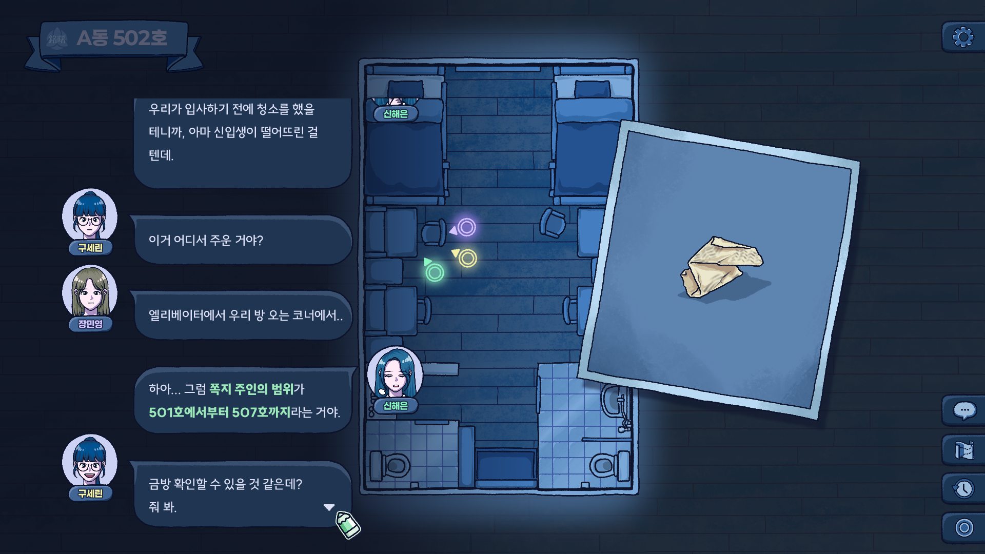낮에는 탐문과 관찰을 통해 단서를 수집하고, 밤에는 502호에 모여 추리하라! 해은이 보고, 듣고, 느끼는 모든 것이 그대로 단서가 된다. 사소한 말, 자그마한 흔적들, 수상한 광경을 포착해 가설을 증명하고 사건의 전말에 다가가자.