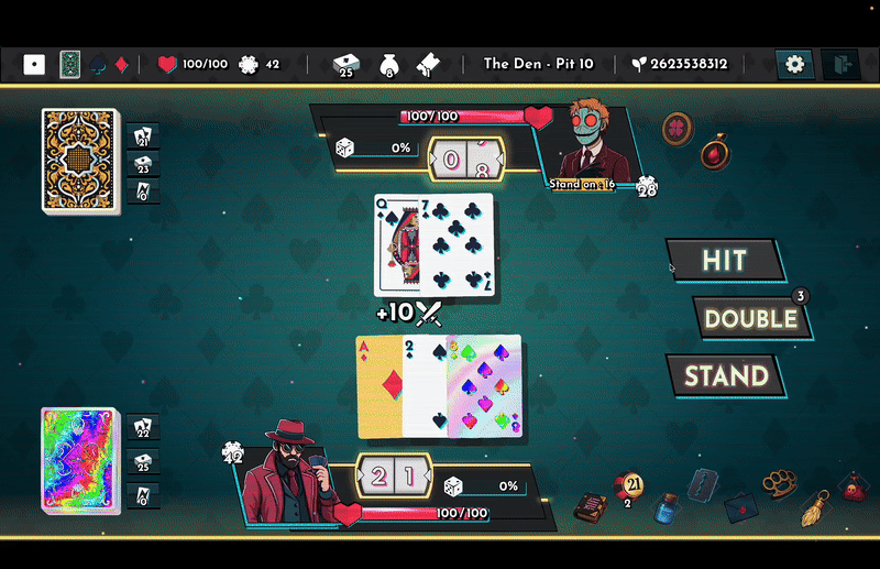 각 핸드는 블랙잭의 표준 규칙에 따라 진행되지만, 모든 히트, 스탠드, 더블 다운이 중요하며 승률을 높이는 데 도움이 되는 일련의 트리거를 생성합니다. 서로 다른 문양의 새 카드를 추가하여 덱을 구성하세요. 모든 카드는 고유한 특전을 가지고 있습니다: