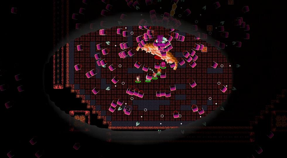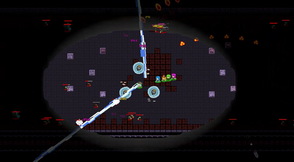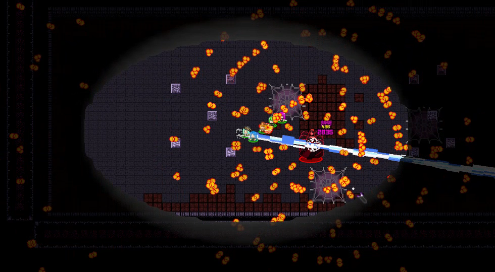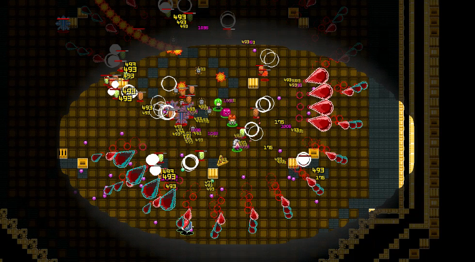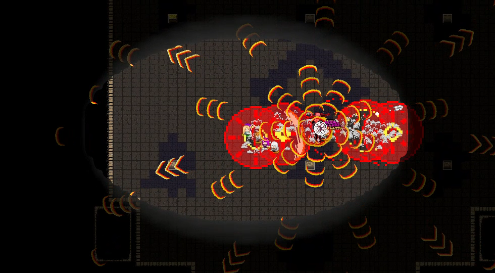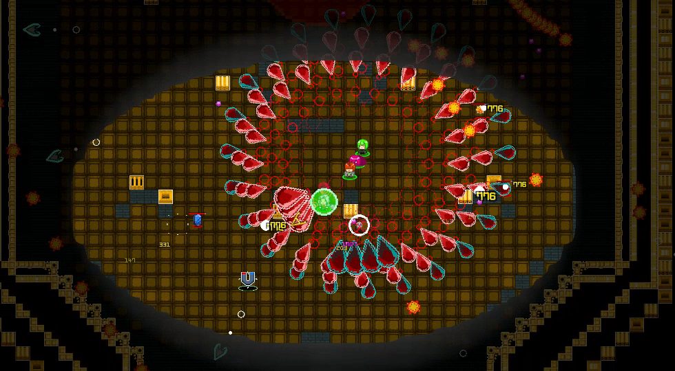 화면을 가득 채우는 스킬 이펙트와 사방에서 몰려오는 적들의 탄막!