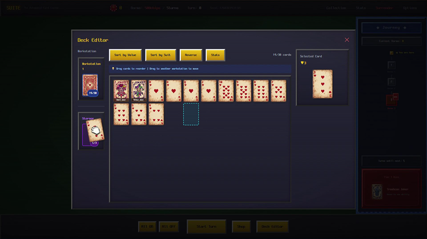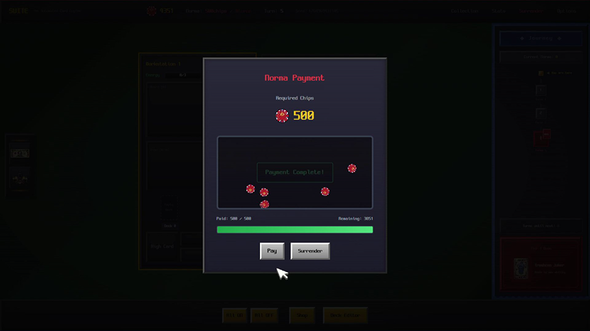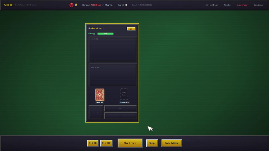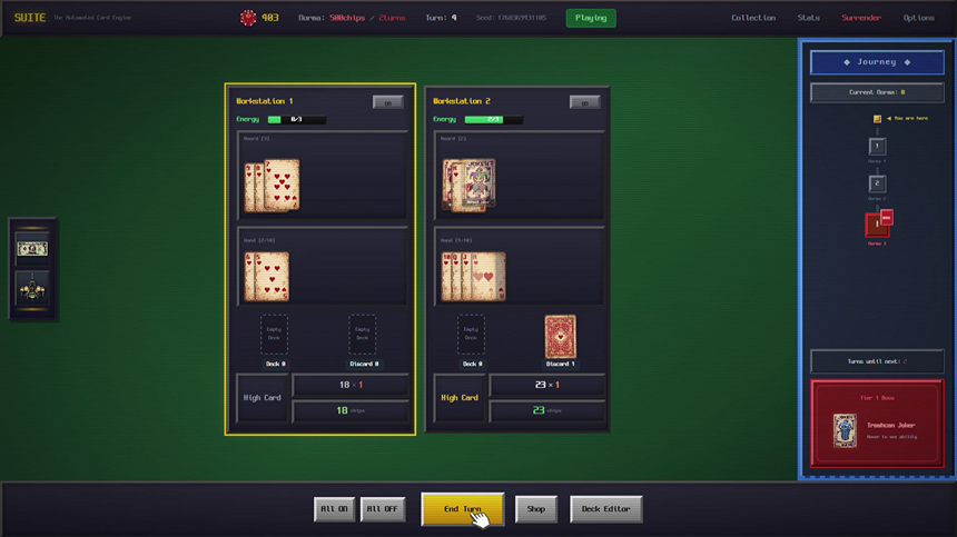 SUITE:Automated Card Engine은 포커 로그라이크 게임입니다. 수많은 작업장을 운영하고, 망가진 카드와 요상한 조커를 사용해 수십 장이 넘는 포커 족보를 만들고 칩을 벌어 떼부자가 되세요.