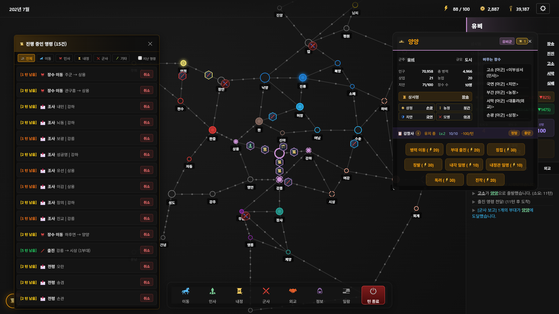 인사, 전쟁, 내정, 외교, 첩보, 일기토...