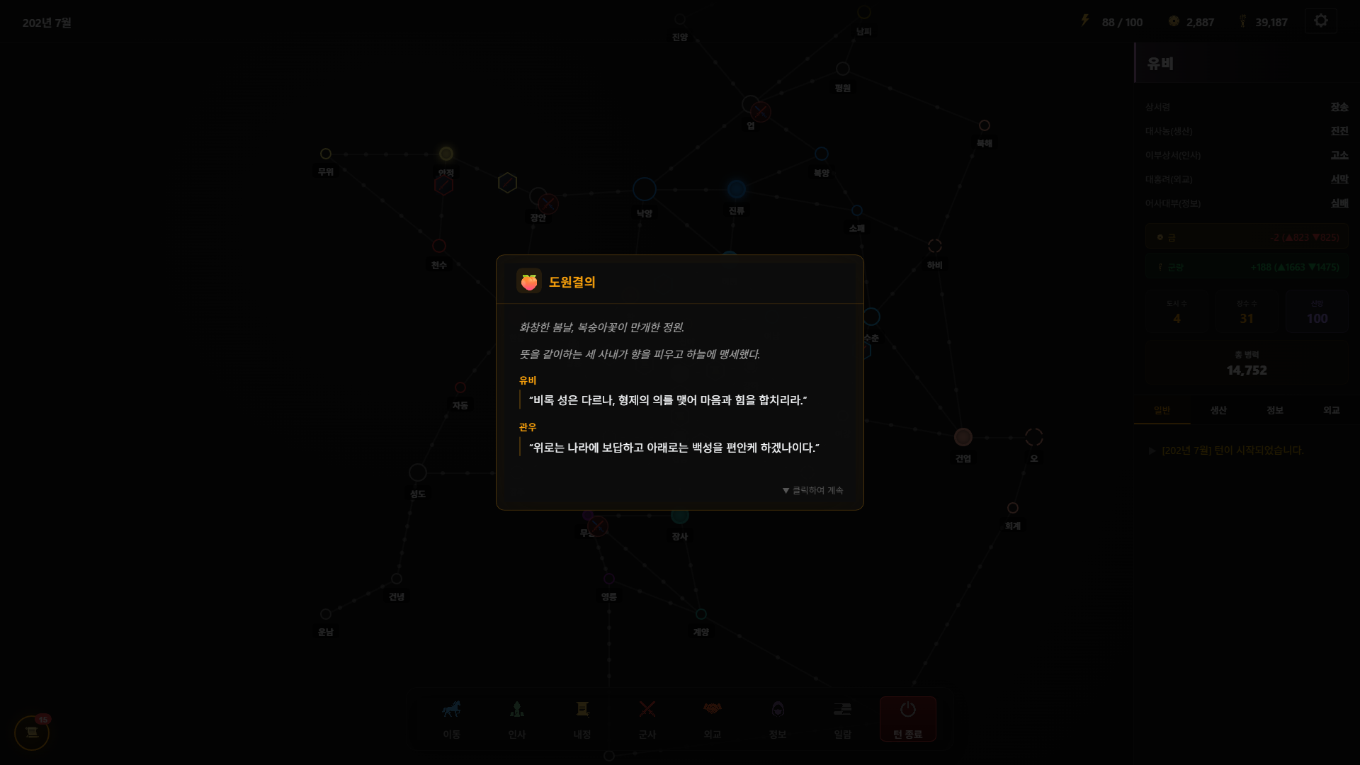 매판 랜덤한 도시에서 랜덤한 부하장수들을 드래프트해 게임을 시작합니다.