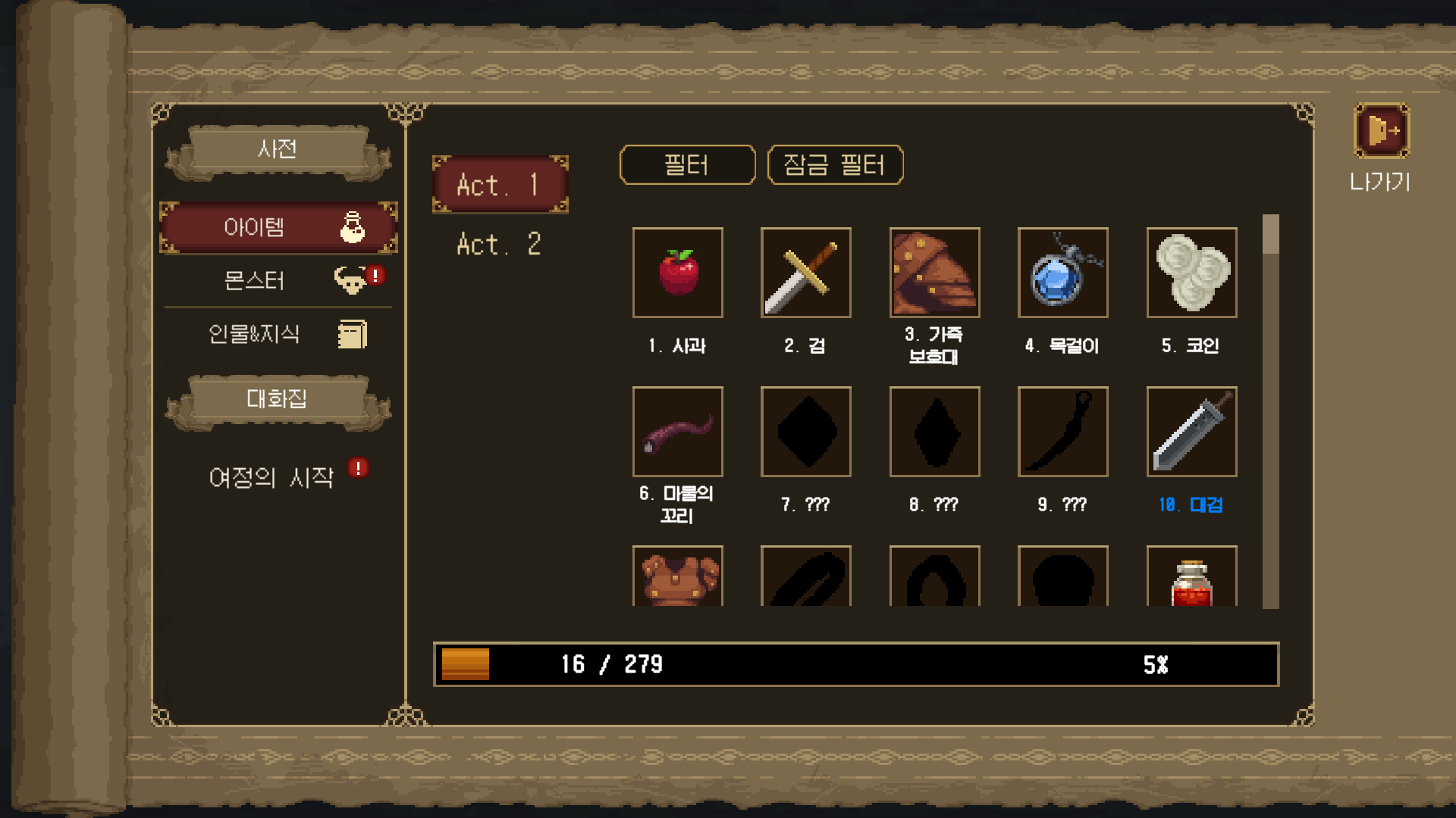인벤토리 슬롯은 제한되어 있기 때문에, 당신의 물건 관리 능력이 운을 제외한 모든 것을 좌지우지합니다.