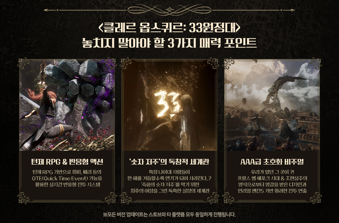 클레르 옵스퀴르: 33 원정대는 독특한 실시간 메커니즘이 가미된 혁신적인 턴제 RPG로, 그 어느 때보다 몰입도 높고 스릴 넘치는 전투를 경험할 수 있습니다. 벨 에포크 시대의 프랑스에서 영감을 받은 판타지 세계를 탐험하며 무시무시한 적들과 맞서 싸우세요.