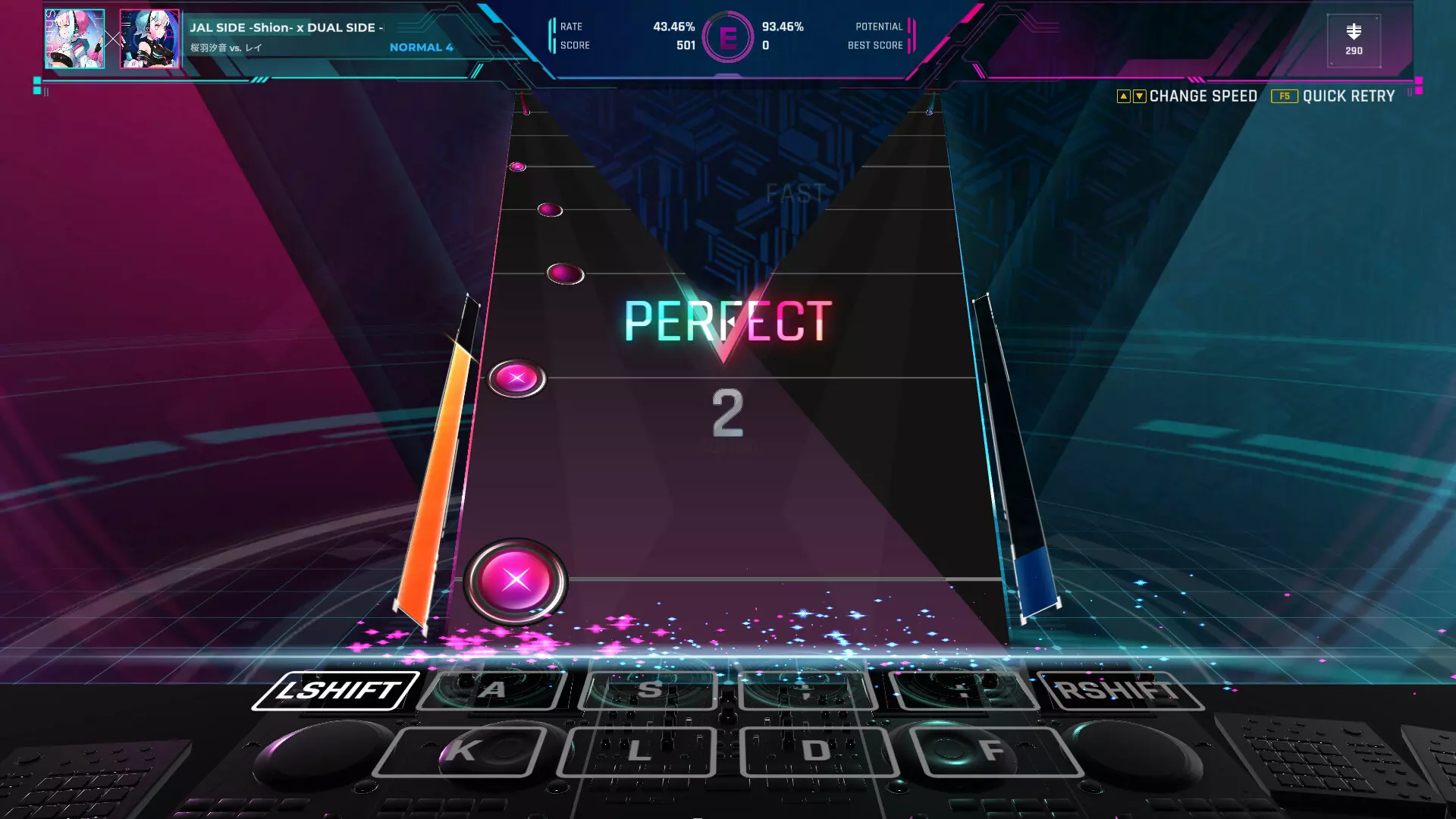 本作採用獨特的「2-Line System 雙軌系統」,音符從兩個不同的軌道流動。只需一個按鍵,即可同時點亮兩條軌道,帶來直觀沉浸的遊戲體驗。