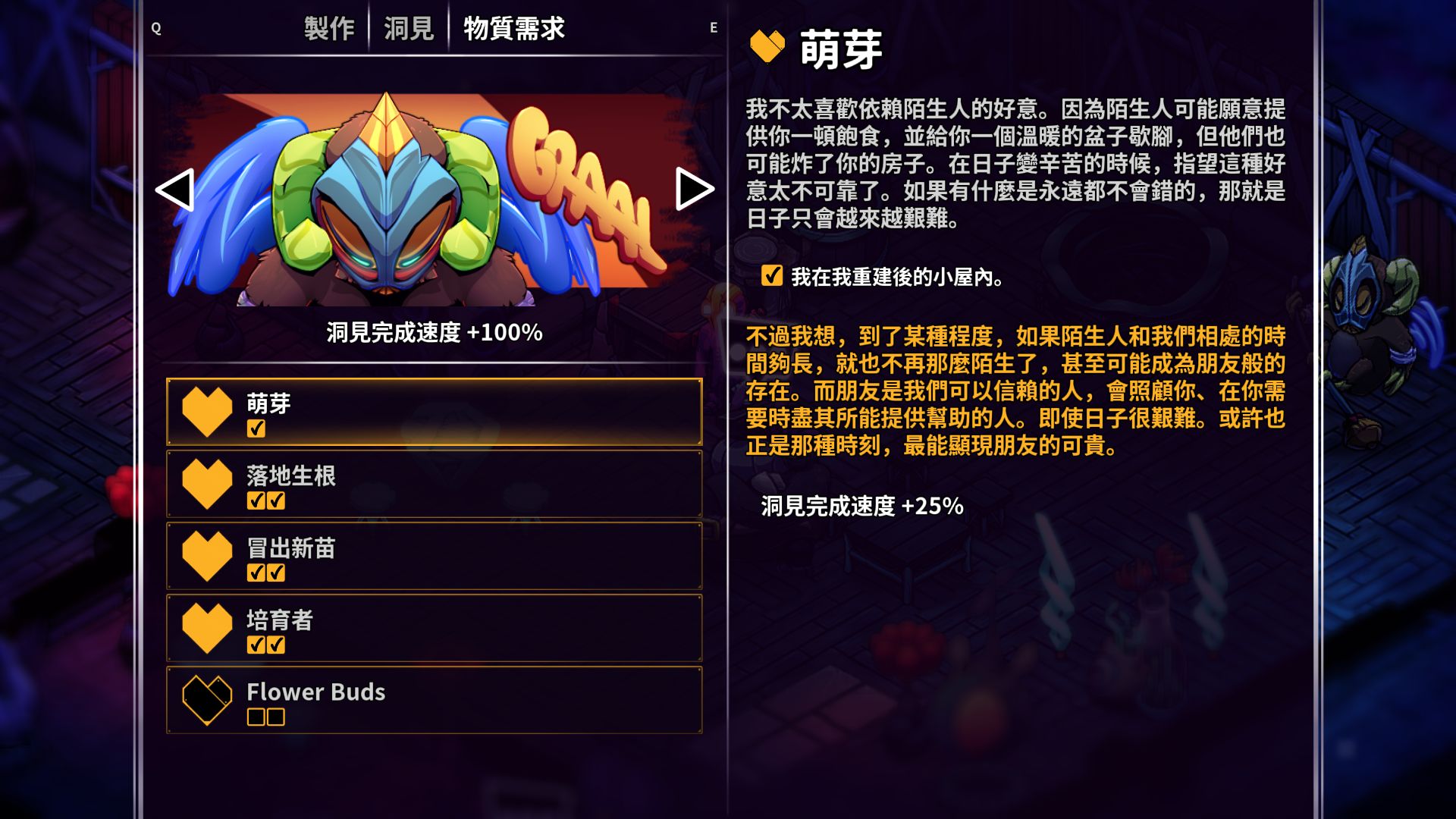 經過漫長一天的荒野探索、與蛞蝓獸戰鬥、被象鼻獸噴得滿身鼻涕後,你需要一個讓自己和外星夥伴們安心休息的地方。打造一個溫馨舒適的異鄉家園,你能不受外界干擾地在此製作物品、聊天與種植,或是照料你領養的孤兒蛞蝓獸寶寶。只要別忘記幫你的新朋友…以及可能的室友準備一些空間就行了。
