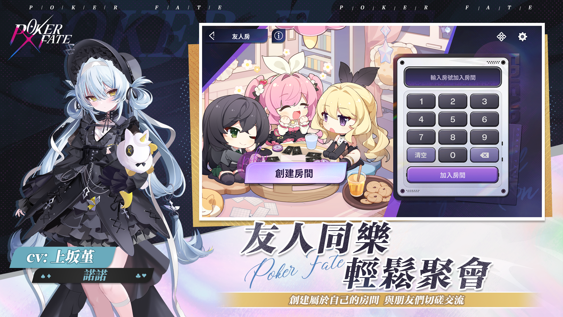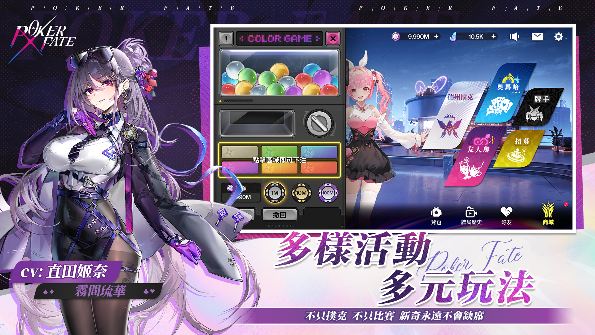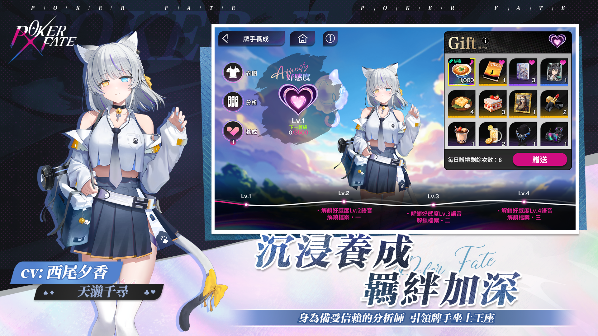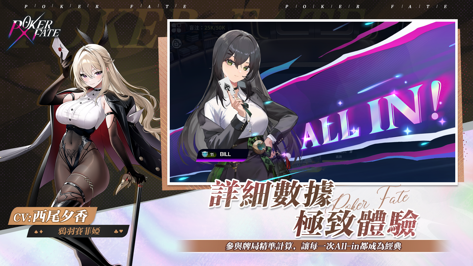 - 透過撲克對局提升好感度,與牌手進行誓約,解鎖全新外觀、限定語音及表情貼圖,深入互動!