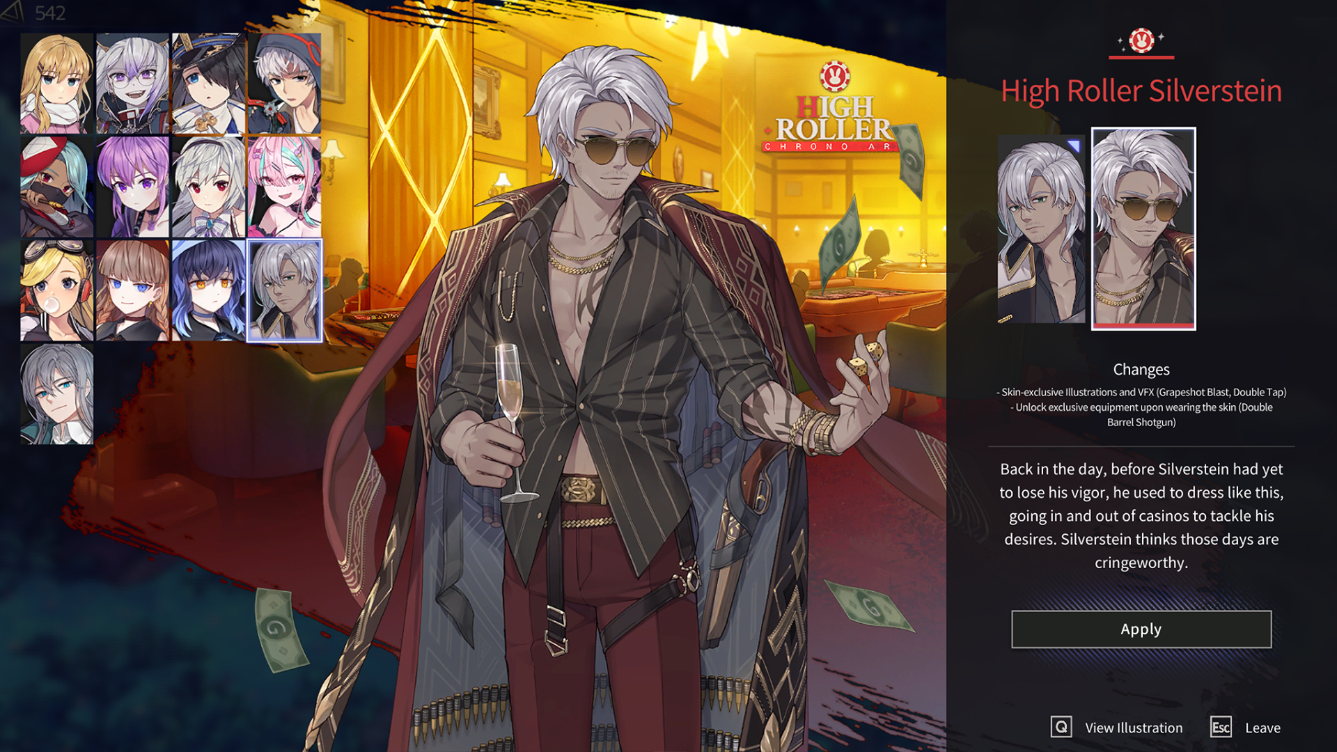 - 調查員賭場皮膚6種(鏈鋸小姐、桃梨、西爾弗斯坦、納爾汗、海拉、賽琳娜)